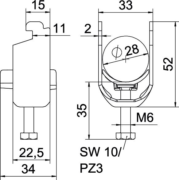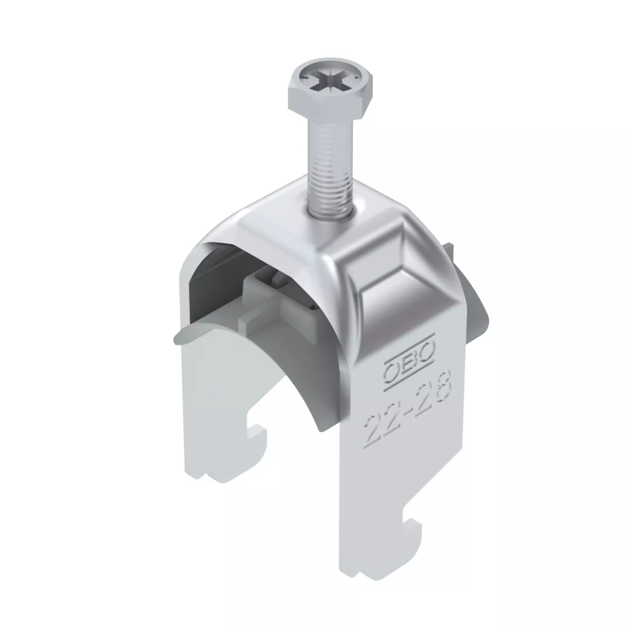 Obejma kabłąkowa, ze stopką typu N, plastikowa wanienka dociskowa wykonana z polipropylenu. Do pionowego i poziomego montażu pojedynczego kabla na szynie o profilu C. Do szczeliny o szerokości 11 - 12 mm. Z gwintem jednoskokowym na wanience dociskowej, łeb sześciokątny uniwersalny SW10, z rowkiem i łbem krzyżakowym Nadaje się do montażu wewnątrz i na zewnątrz Zalecamy użycie wanienki dociskowej