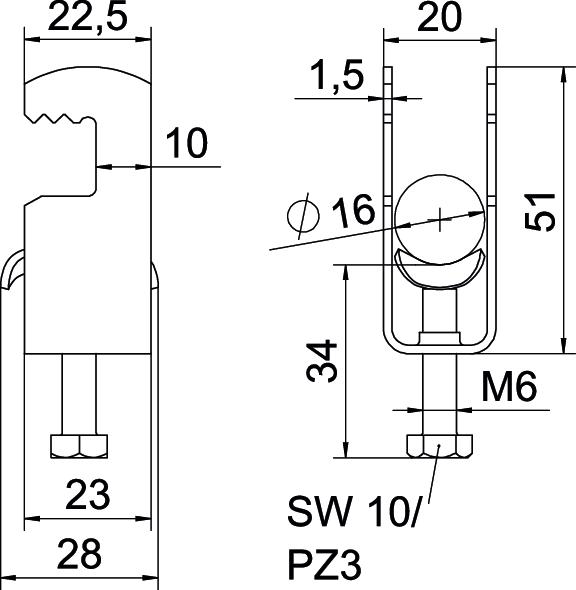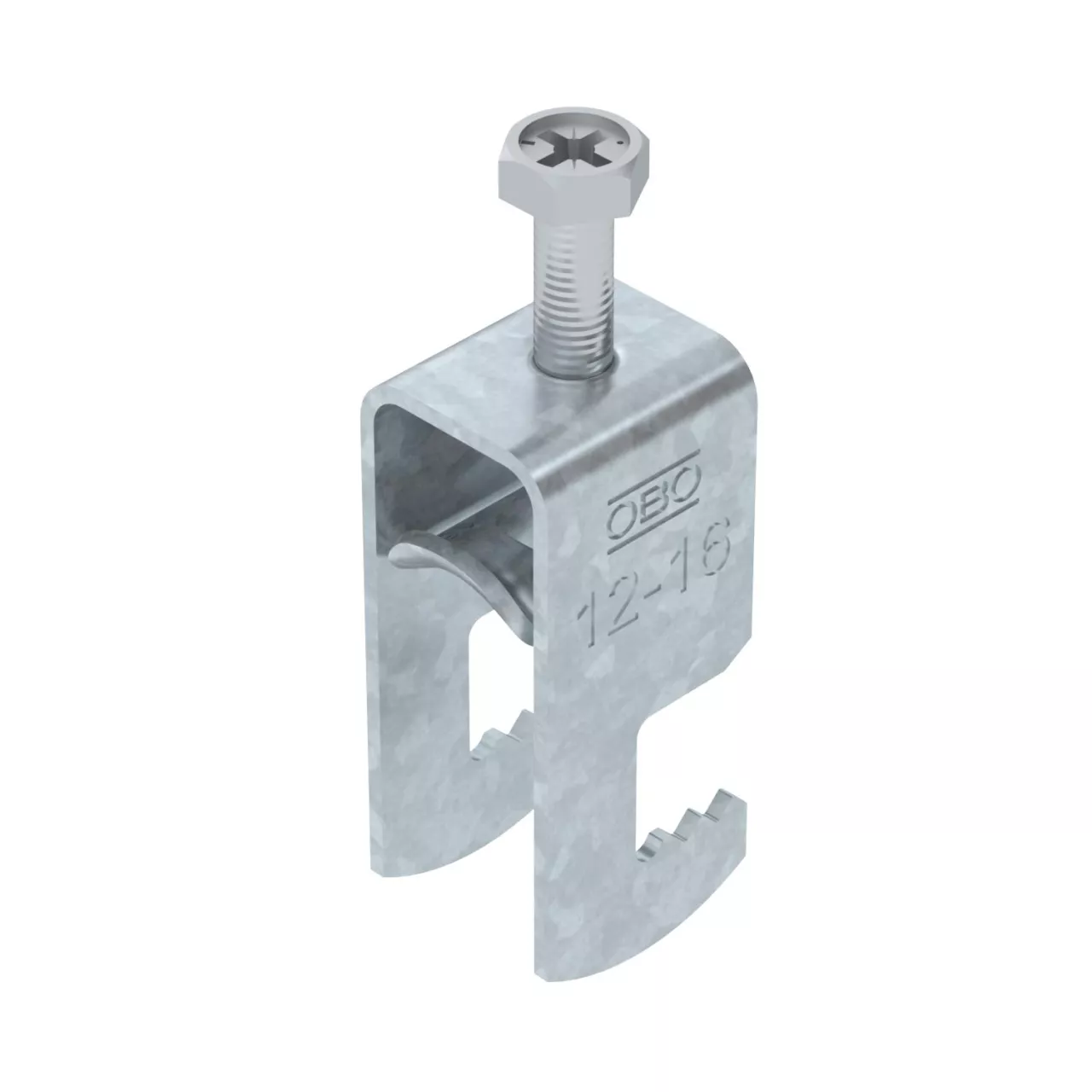 Obejma kabłąkowa, ze stopką typu F, metalowa wanienka dociskowa z zaokrąglonymi krawędziami do ochrony kabli. Do pionowego i poziomego montażu 1 pojedynczego kabla na płaskowniku. Z gwintem jednoskokowym na wanience dociskowej, łeb sześciokątny uniwersalny SW10, z rowkiem i łbem krzyżakowym Nadaje się do montażu wewnątrz i na zewnątrz Zalecamy użycie wanienki dociskowej