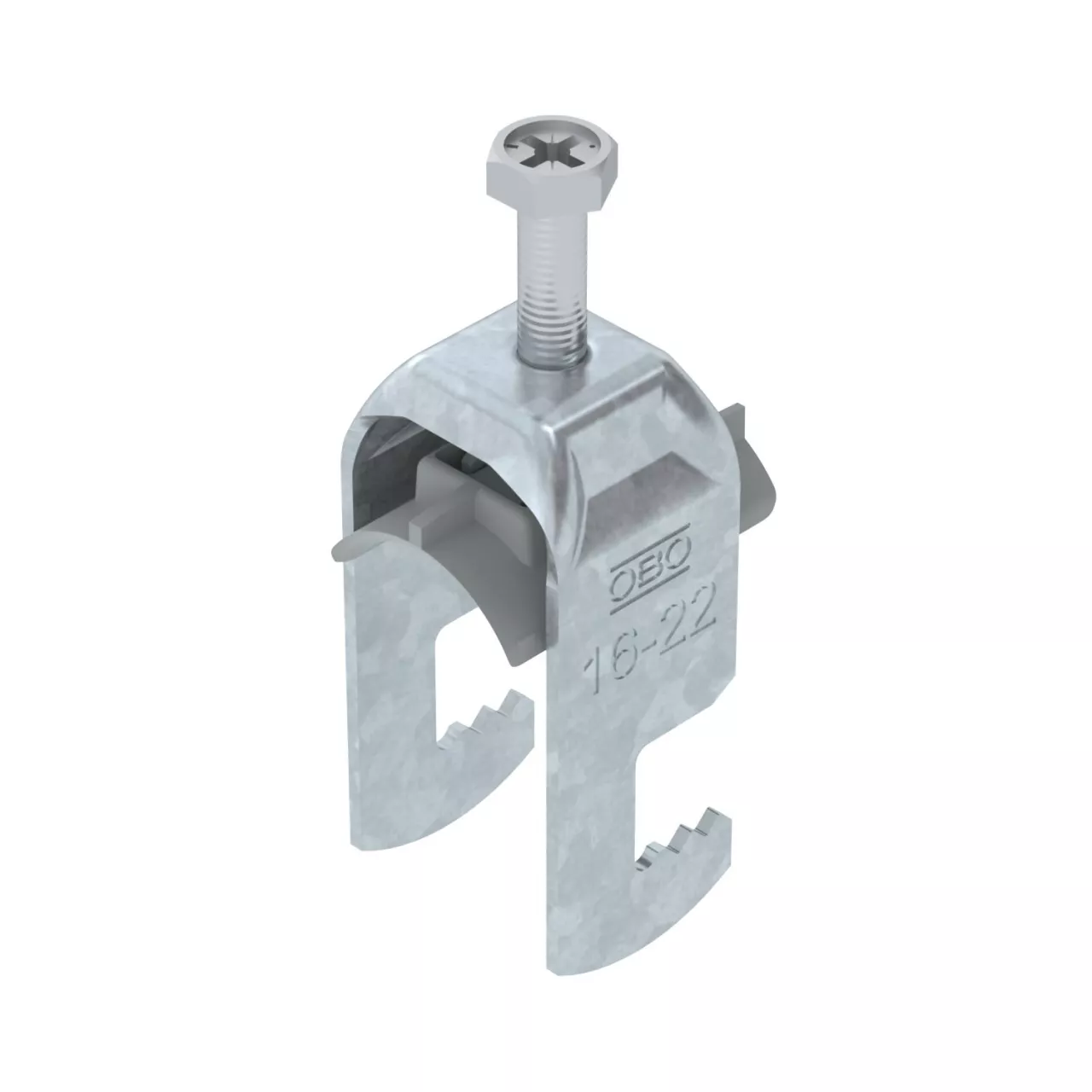 Obejma kabłąkowa, ze stopką typu F, plastikowa wanienka dociskowa wykonana z polipropylenu. Do pionowego i poziomego montażu 1 pojedynczego kabla na płaskowniku. Z gwintem jednoskokowym na wanience dociskowej, łeb sześciokątny uniwersalny SW10, z rowkiem i łbem krzyżakowym Nadaje się do montażu wewnątrz i na zewnątrz Zalecamy użycie wanienki dociskowej