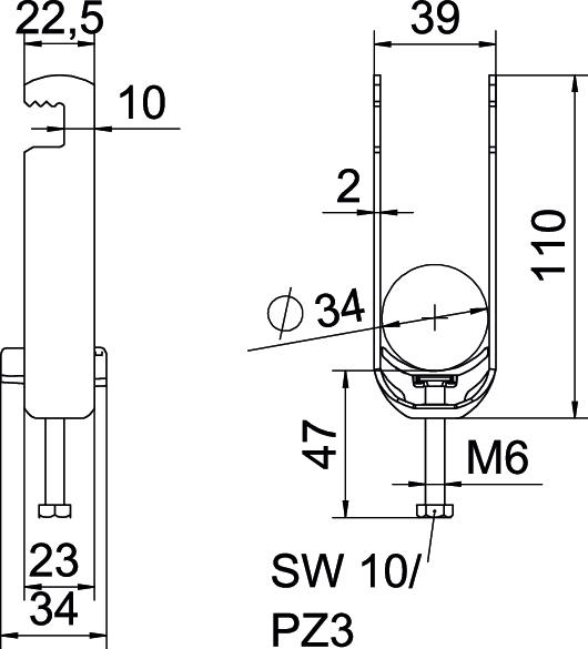 Obejma kabłąkowa, ze stopką typu F, plastikowa wanienka dociskowa wykonana z polipropylenu. Do pionowego i poziomego montażu 2 pojedynczych kabli na płaskowniku. Z gwintem jednoskokowym na wanience dociskowej, łeb sześciokątny uniwersalny SW10, z rowkiem i łbem krzyżakowym Nadaje się do montażu wewnątrz i na zewnątrz Paczki kabli powinny być oddzielone dodatkową wanienką dociskową Zalecamy użycie wanienki dociskowej