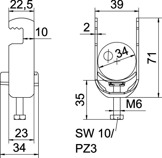 Obejma kabłąkowa, ze stopką typu F, plastikowa wanienka dociskowa wykonana z polipropylenu. Do pionowego i poziomego montażu 1 pojedynczego kabla na płaskowniku. Z gwintem jednoskokowym na wanience dociskowej, łeb sześciokątny uniwersalny SW10, z rowkiem i łbem krzyżakowym Nadaje się do montażu wewnątrz i na zewnątrz Zalecamy użycie wanienki dociskowej