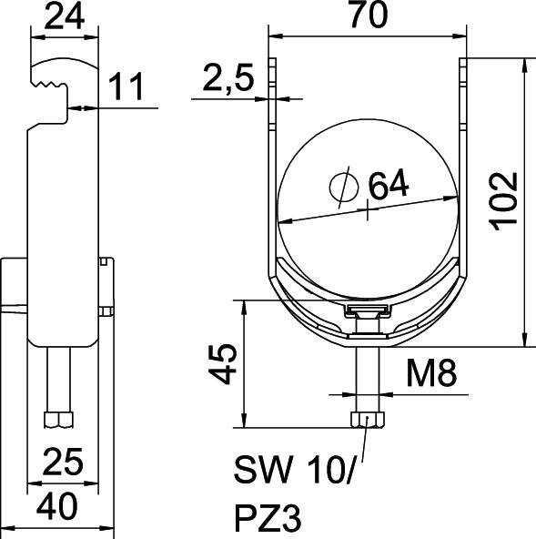 Obejma kabłąkowa, ze stopką typu F, plastikowa wanienka dociskowa wykonana z polipropylenu. Do pionowego i poziomego montażu 1 pojedynczego kabla na płaskowniku. Z gwintem jednoskokowym na wanience dociskowej, łeb sześciokątny uniwersalny SW10, z rowkiem i łbem krzyżakowym Nadaje się do montażu wewnątrz i na zewnątrz Zalecamy użycie wanienki dociskowej