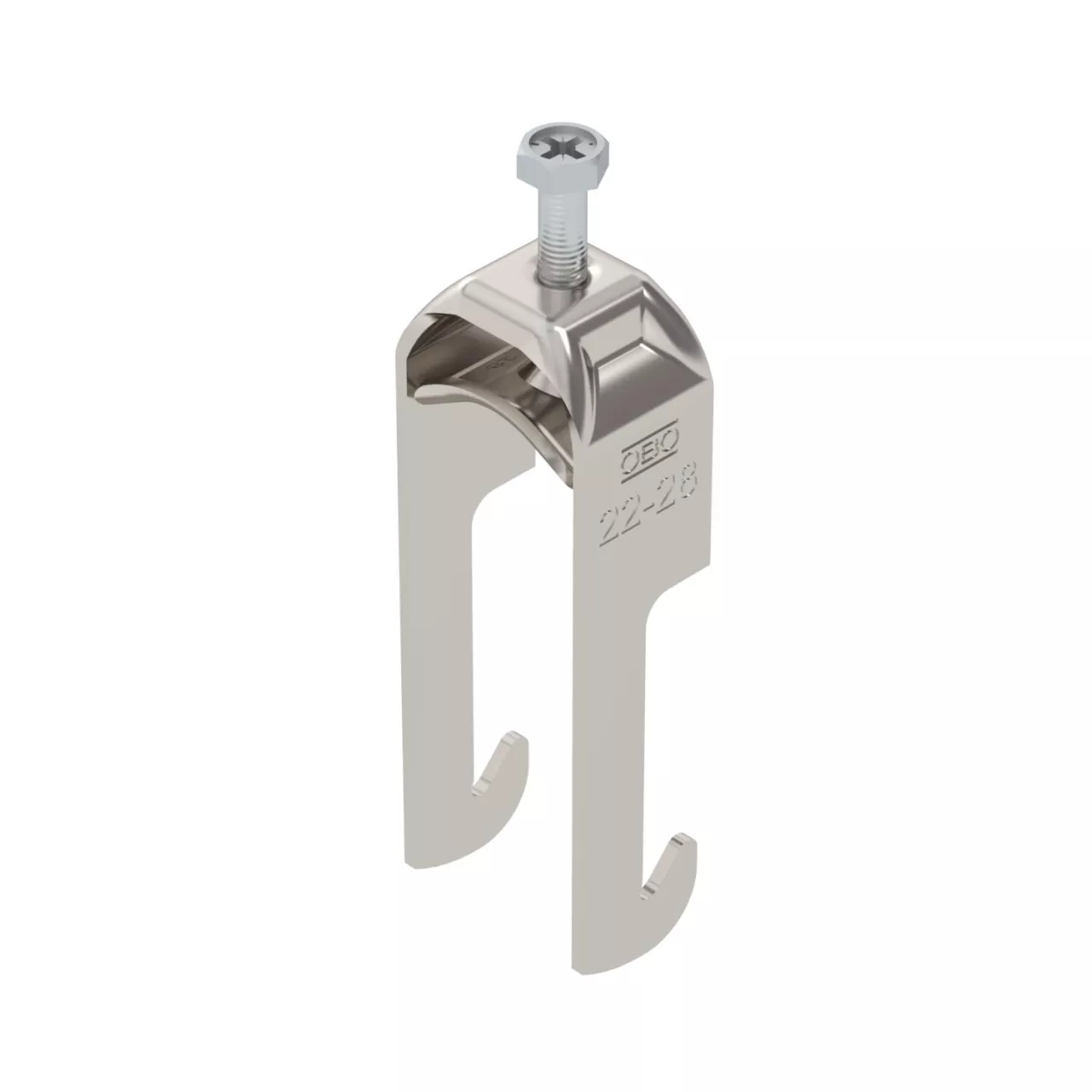 Obejma kabłąkowa, ze stopką typu W, metalowa wanienka dociskowa z zaokrąglonymi krawędziami do ochrony kabli. Do pionowego i poziomego montażu 1 pojedynczego kabla na kątownikach do < 40 mm. Z gwintem jednoskokowym na wanience dociskowej, łeb sześciokątny uniwersalny SW10, z rowkiem i łbem krzyżakowym Nadaje się do montażu wewnątrz i na zewnątrz Zalecamy użycie wanienki dociskowej