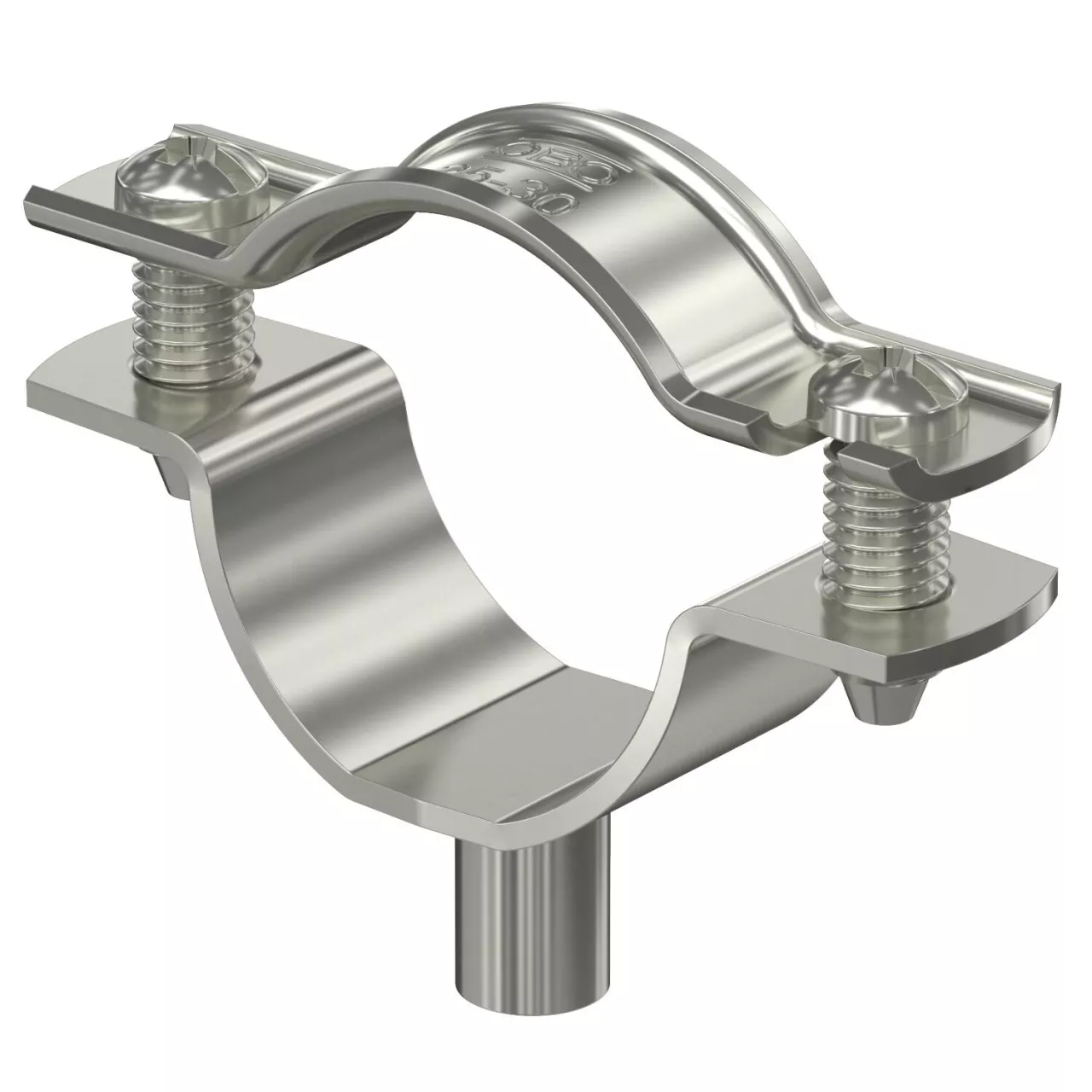 Montaż za pomocą obejmy dystansowej śrubowej. Obejmy dystansowe i obejmy dystansowe śrubowe produkuje się z różnych materiałów: ze stali nierdzewnej V2A, ze stali cynkowanej galwanicznie lub ogniowo a także z aluminium. Mocowanie można wykonać za pomocą kotew wkręcanych lub kołków rozporowych i śrub Sprint.