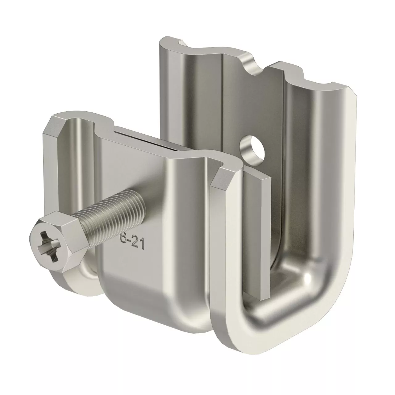 Ten typ klamry wspornika jest nasuwany na wspornik i mocowany do niego lub do płaskownika za pomocą wanny ciśnieniowej oraz śruby (M8). Śruba z łbem sześciokątnym pod klucz 10. Zacisk posiada również dwa otwory gwintowane M6 do montażu, na przykład, prętów gwintowanych.