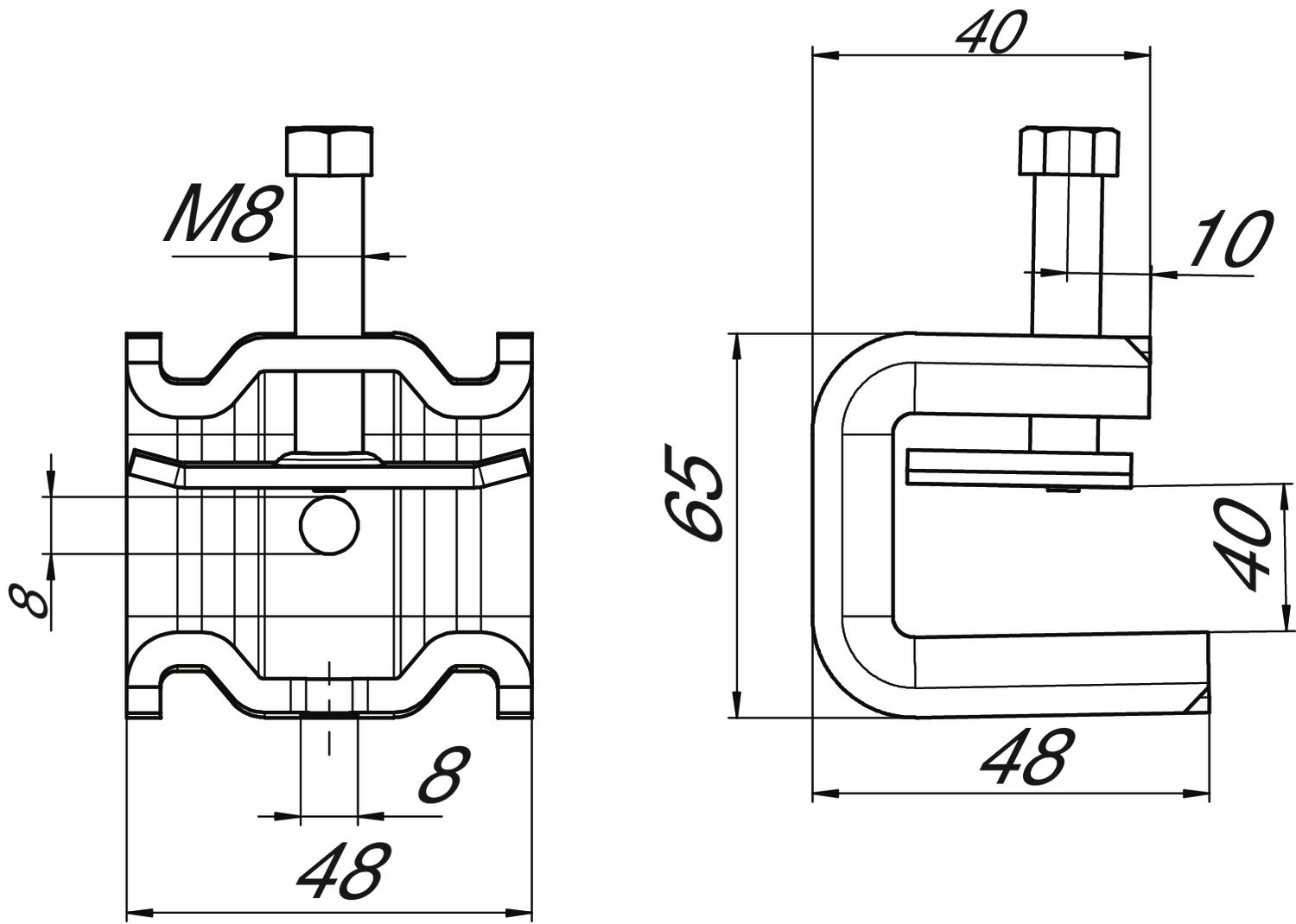 Ten typ klamry wspornika jest nasuwany na wspornik i mocowany do niego lub do płaskownika za pomocą wanny ciśnieniowej oraz śruby (M8). Śruba z łbem sześciokątnym pod klucz 10. Zacisk posiada również dwa otwory gwintowane M8 do montażu, na przykład, prętów gwintowanych.