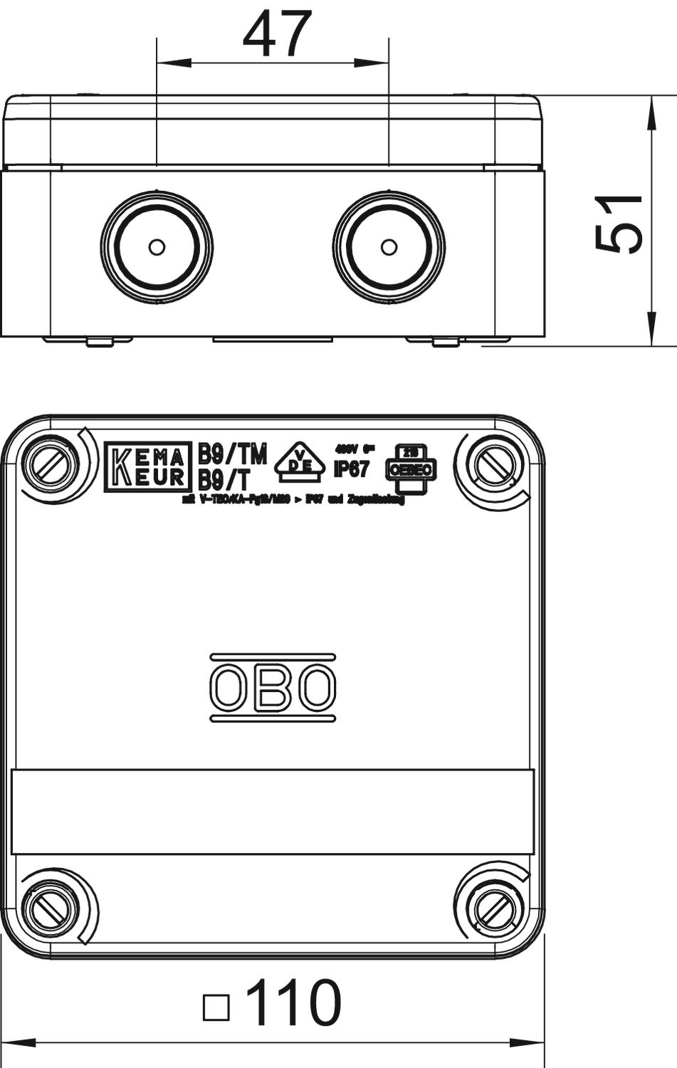 Puszka odgałęźna OBO B 9/T składa się z dwóch elementów z bezhalogenowego termoplastu: miękkiego na uszczelkę i twardego na obudowę. Dwuelementowa technologia zapewnia doskonałą szczelność i stabilność. Stopień ochrony IP67 jest zagwarantowany nawet wówczas, gdy membrana jest bezpośrednio przebijana za pomocą kabli lub przewodów. Do nagwintowanych otworów w ściankach bocznych można dodatkowo wkręcić dławik kablowy w celu zabezpieczenia kabla przed wyrwaniem.