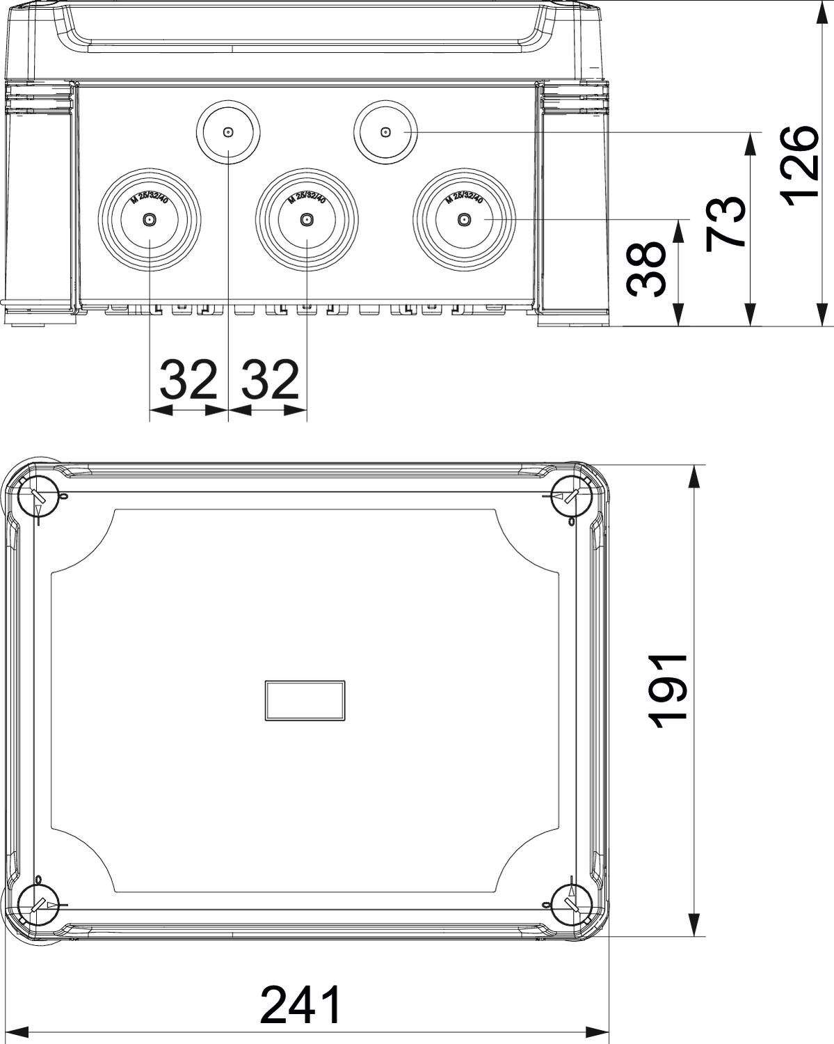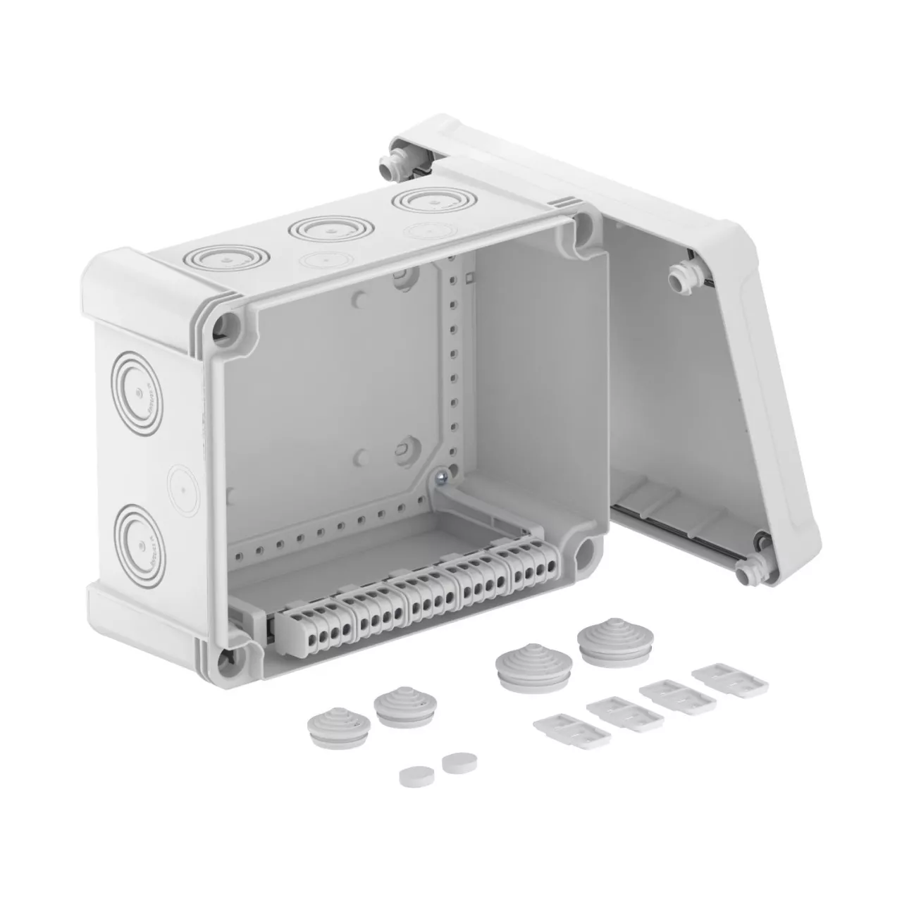 Junction box with terminal strip for the connection of cables and lines indoors and in outdoor areas. Rectangular design with knock-out entries. Suitable for wall and ceiling mounting with the option to fasten outside, inside or to mount via the corner domes. Particularly impact resistant with IK09. Cover with quick lock, sealable. Made from halogen-free and UV-resistant materials. With terminal.