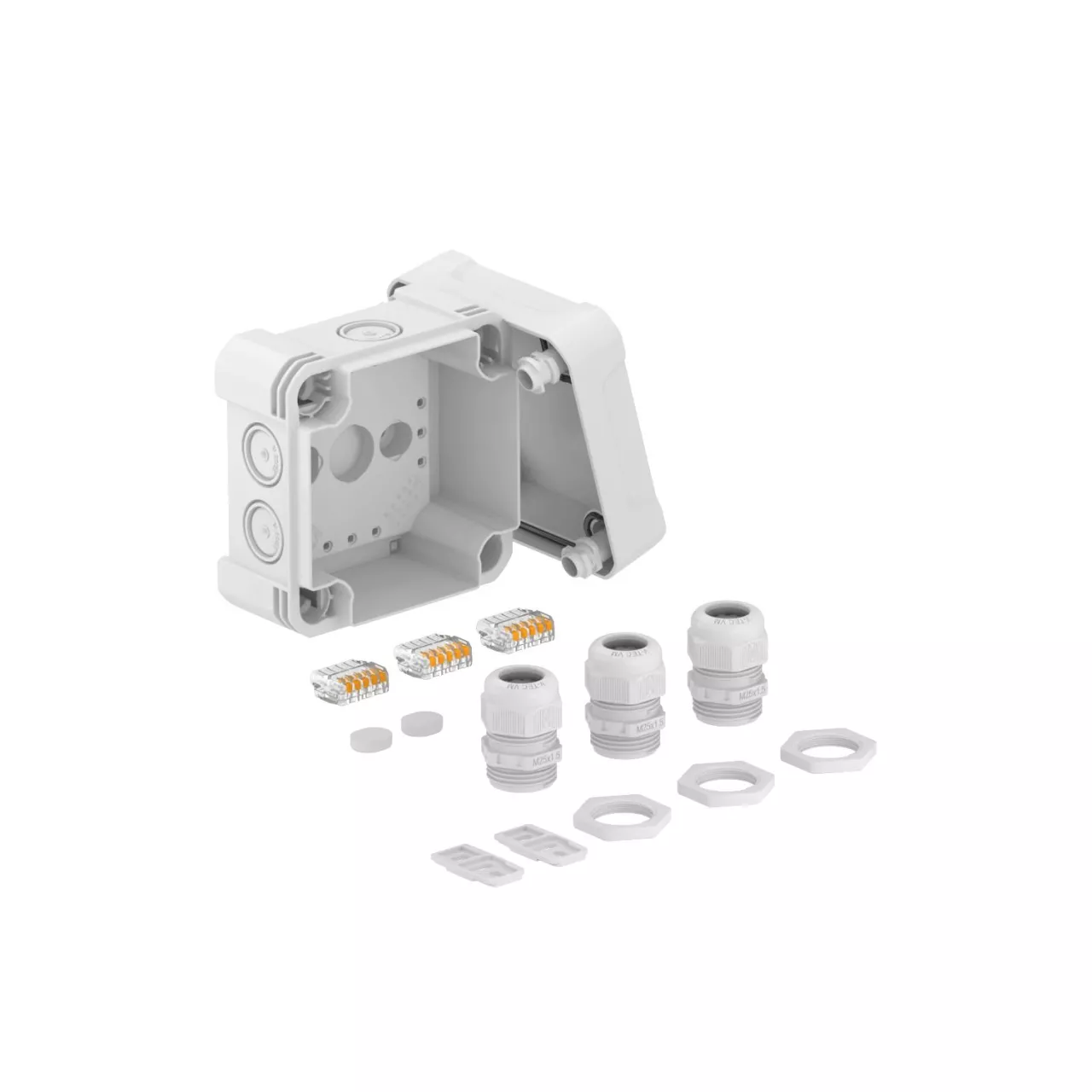 Junction box with terminal for the connection of cables and lines indoors and in outdoor areas. Square design with knock-out entries. Suitable for wall and ceiling mounting with the option to fasten outside, inside or to mount via the corner domes. Particularly impact resistant with IK09. Cover with quick lock, sealable. Made from halogen-free and UV-resistant materials.