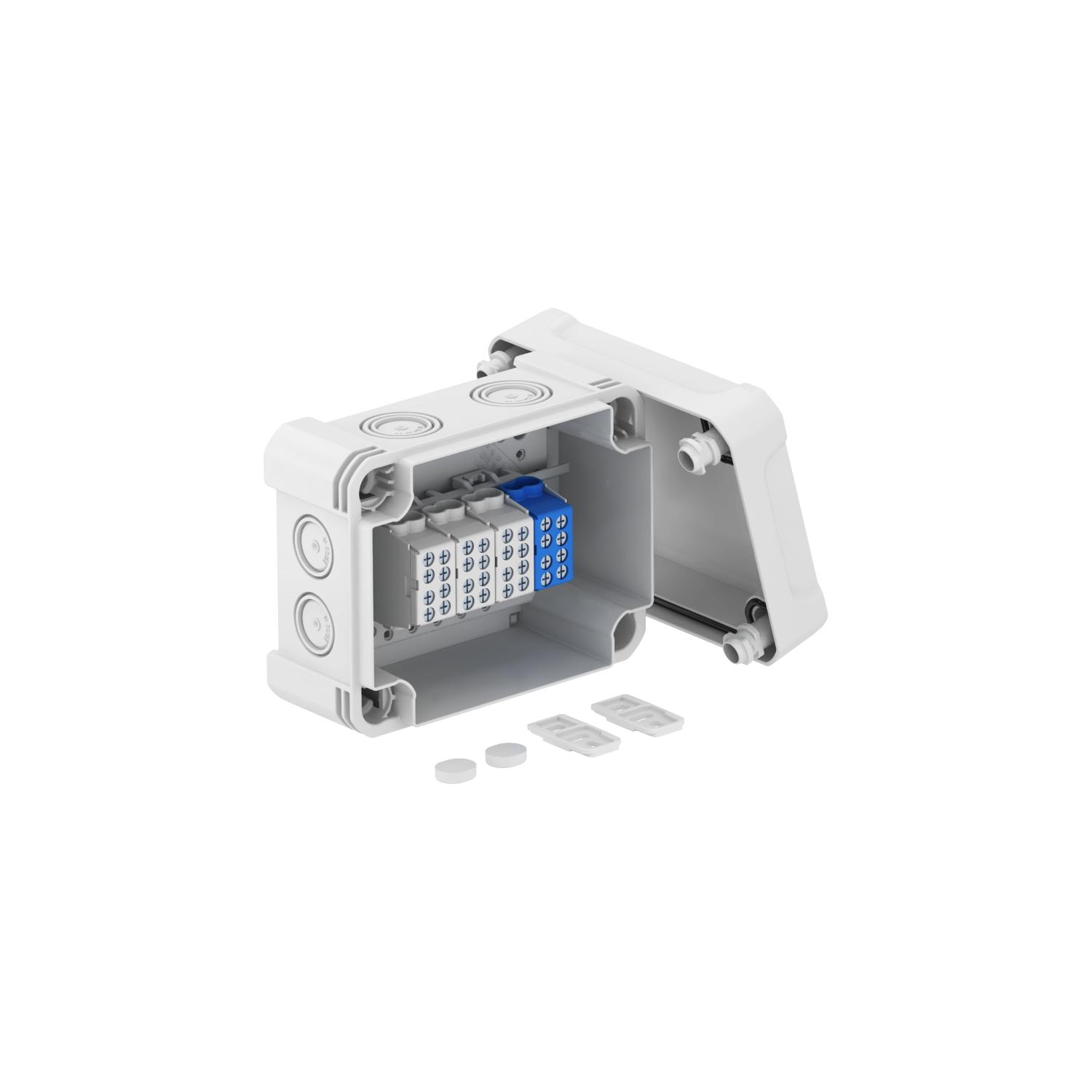 Junction box with terminal for the connection of cables and lines indoors and in outdoor areas. Rectangular design with knock-out entries. Suitable for wall and ceiling mounting with the option to fasten outside, inside or to mount via the corner domes. Particularly impact resistant with IK09. Cover with quick lock, sealable. Made from halogen-free and UV-resistant materials.