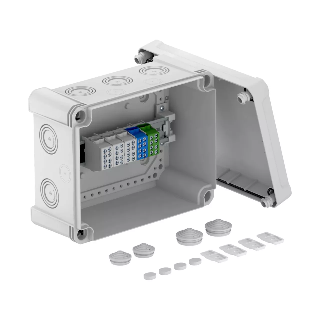 Including 5-pole main terminal block with 2 x 25 mm² + 2 x 16 mm² cable connection cross-sections per pole. Junction box according to DIN EN 60670. Flame-resistant to DIN EN 60695/2/11, test temperature 650 °C. Impact resistance IK09 according to DIN EN 50102. Protection rating IP67 according to DIN EN 60529.
