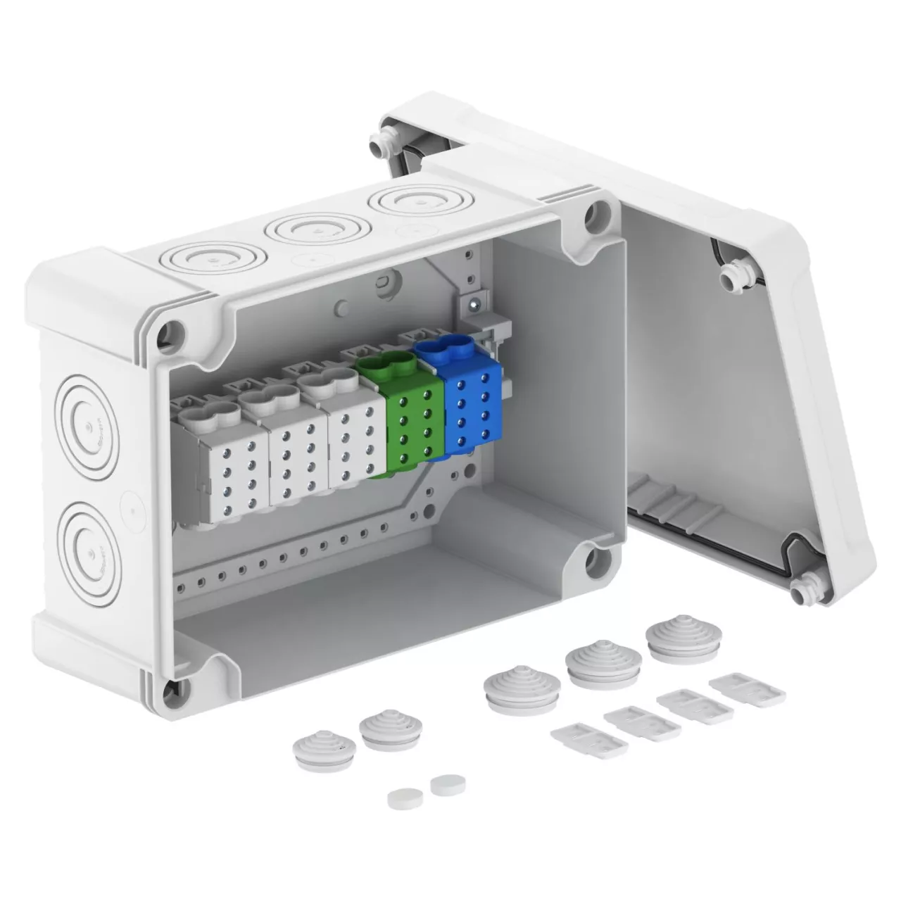 Including 5-pole main terminal block with 4 x 50 mm² cable connection cross-sections per pole. Junction box according to DIN EN 60670. Flame-resistant to DIN EN 60695/2/11, test temperature 650 °C. Impact resistance IK08 according to DIN EN 50102. Protection rating IP67 according to DIN EN 60529.