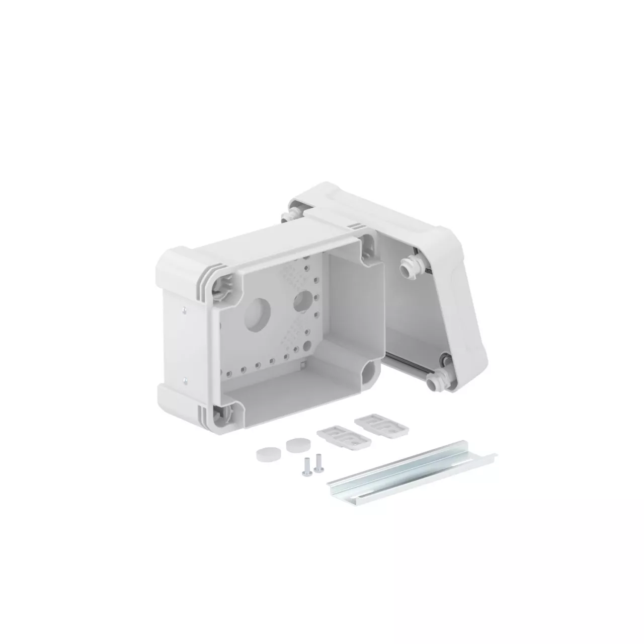 Junction box with hat profile rail for the connection of cables and lines indoors and in outdoor areas. Rectangular design without entries. Suitable for wall and ceiling mounting with the option to fasten outside, inside or to mount via the corner domes. Particularly impact resistant with IK08. Cover with quick lock, sealable. Made from halogen-free and UV-resistant materials.