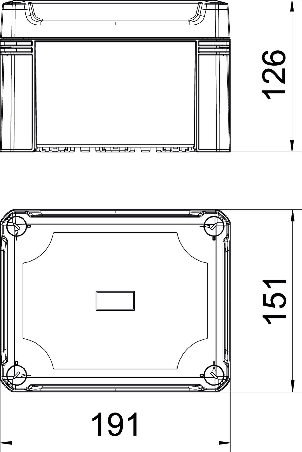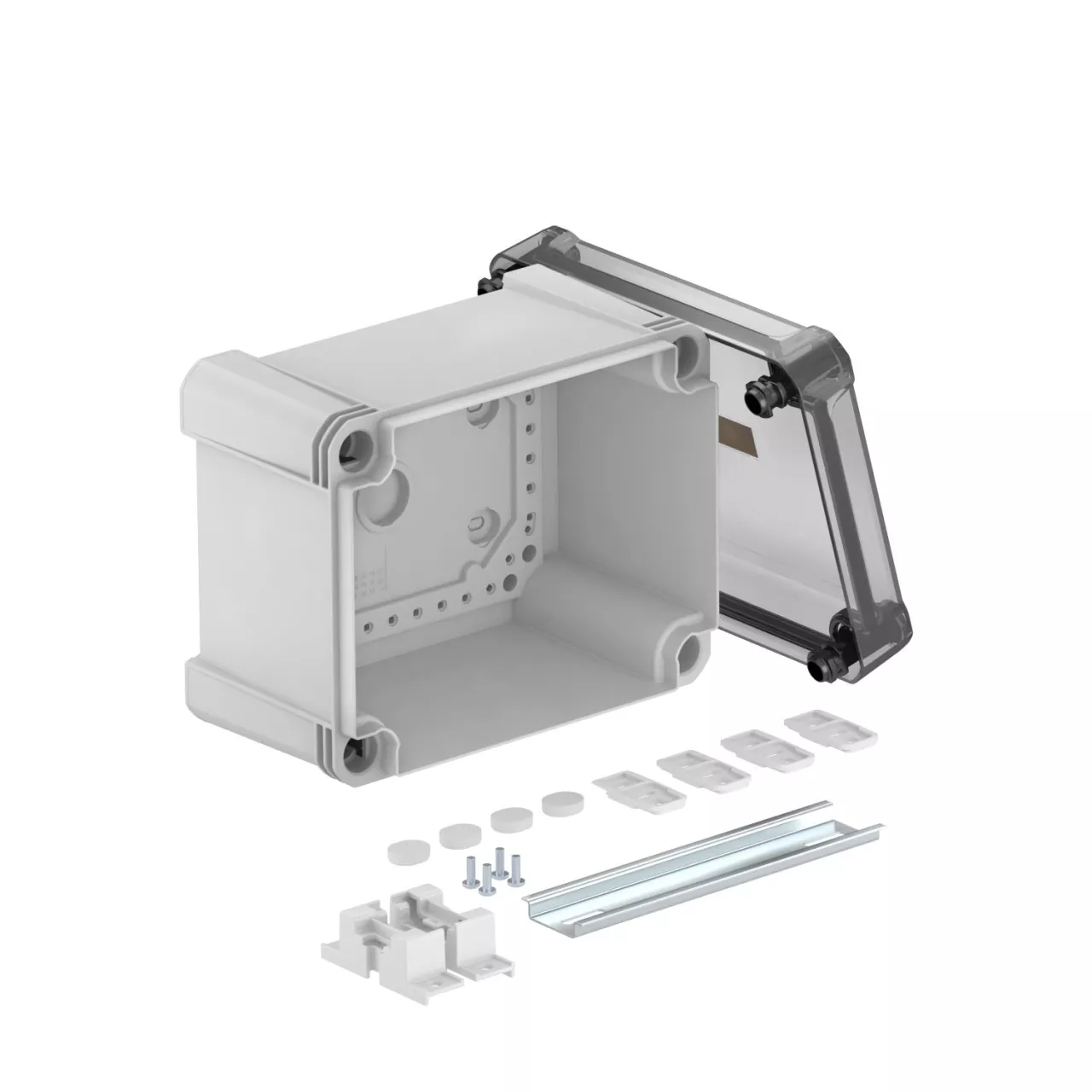 Junction box with hat profile rail for the connection of cables and lines indoors and in outdoor areas. Rectangular design without entries. Suitable for wall and ceiling mounting with the option to fasten outside, inside or to mount via the corner domes. Particularly impact resistant with IK09. Transparent cover with quick lock, sealable. Made from halogen-free and UV-resistant materials.