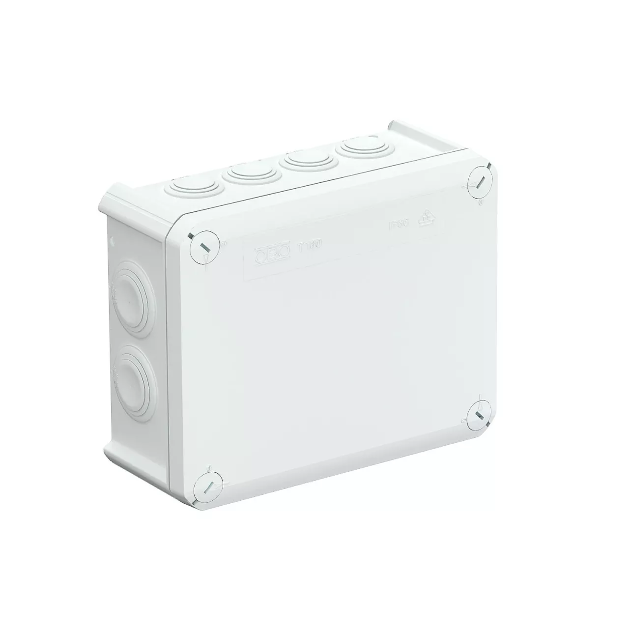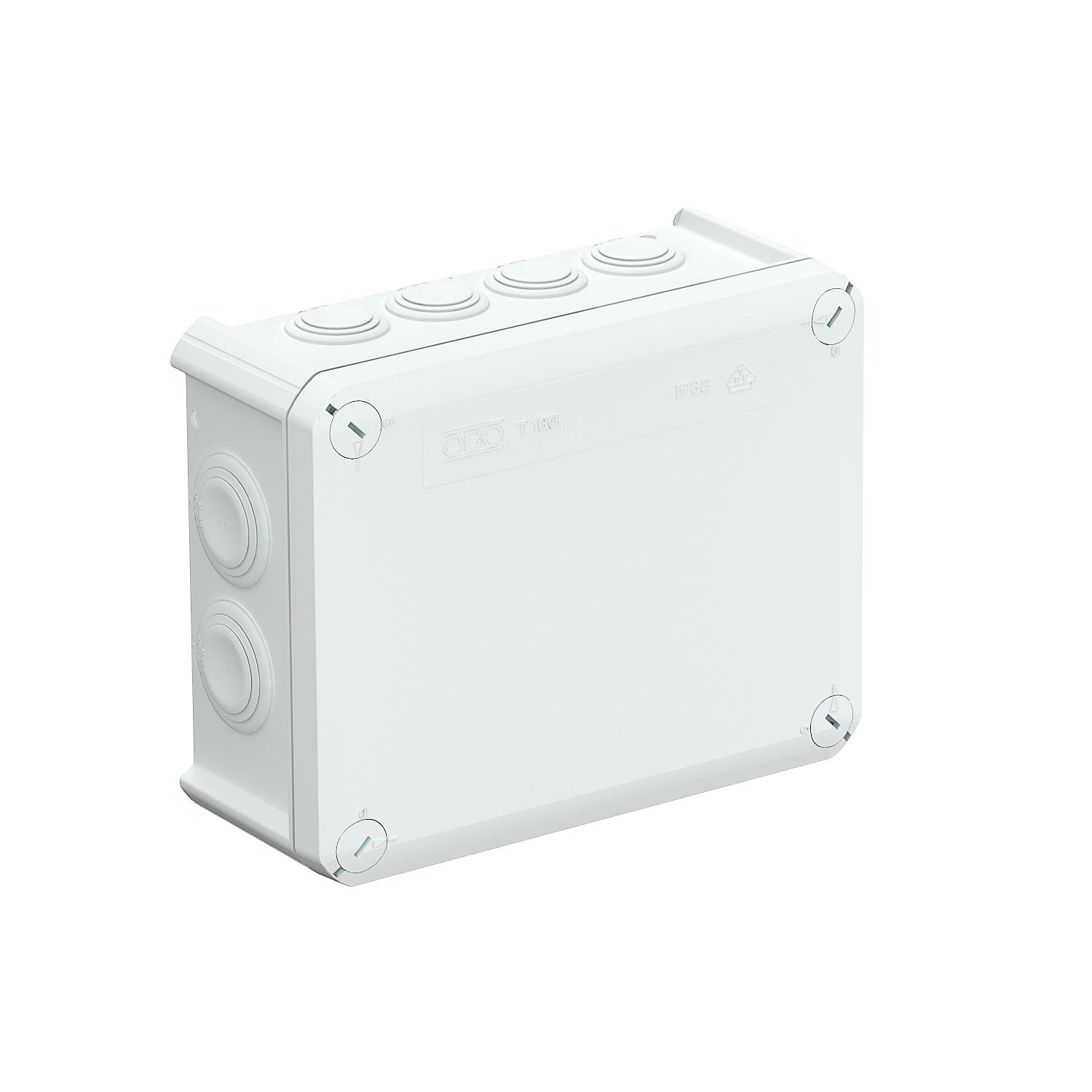 Junction box for the connection of cables and lines indoors and in protected outdoor areas. Rectangular design with plug-in seals to the sides and knock-out entries in the bottom. Suitable for wall and ceiling mounting and on mounting panels. With the option to fasten inside and to mount via the corner domes. Cover with quick lock, sealable. Flame-resistant type made from special polypropylene.