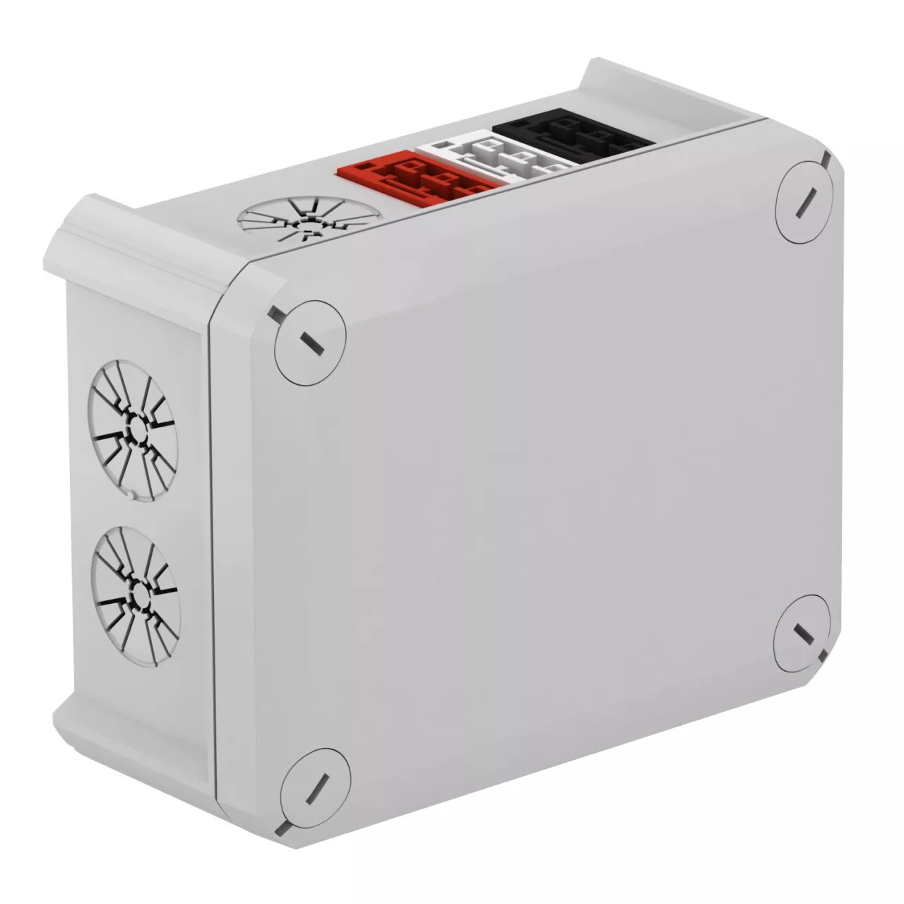 Junction box with WAGO sockets, 3-pin. 2x red/white/black for the connection of cables indoors and in protected outdoor areas. Suitable for wall and ceiling mounting and on mounting panels. With the option of fastening inside and to mount via the corner domes. Cover with quick lock, sealable. Made from halogen-free and UV-stabilized materials.