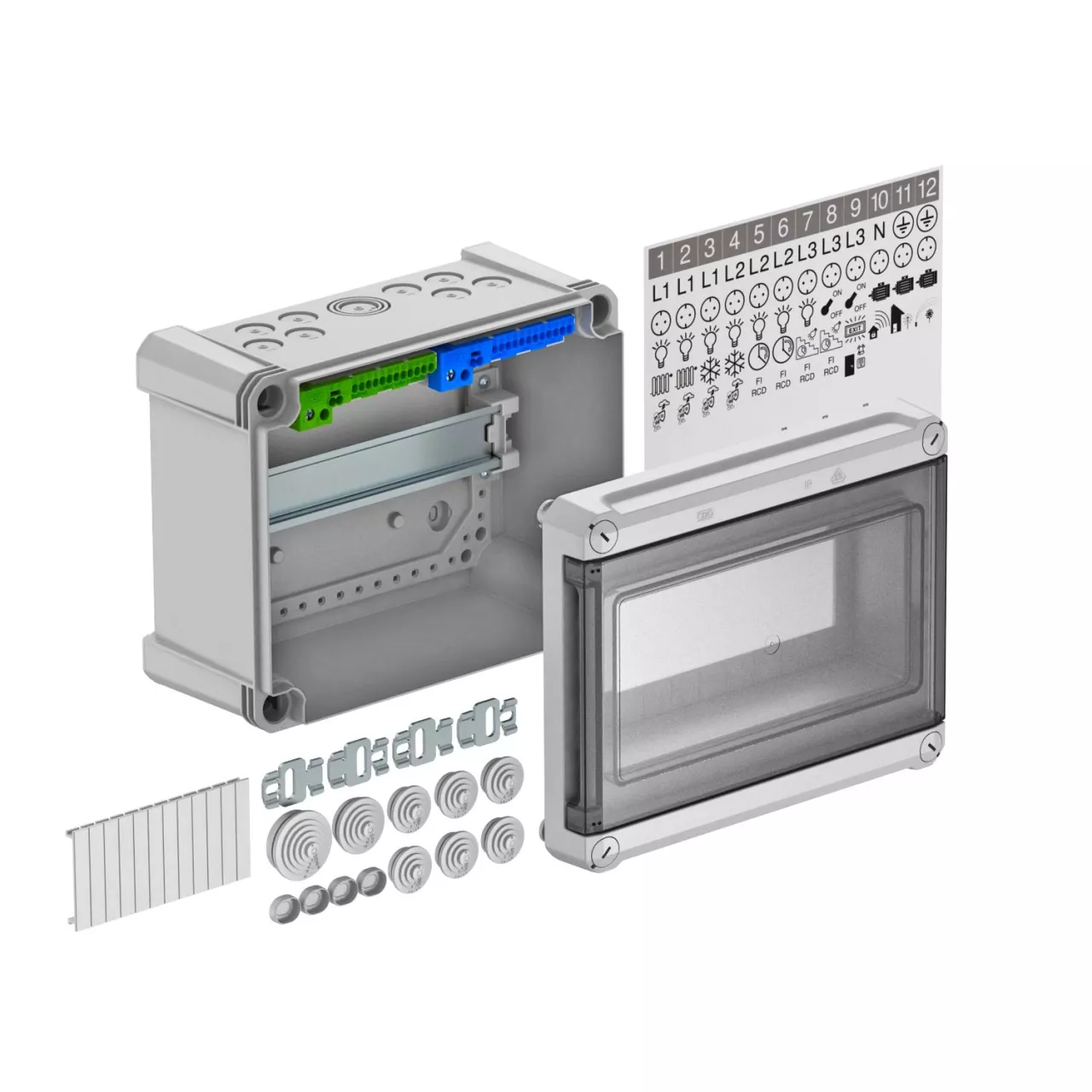 Małe rozdzielnice z listwami zaciskowymi zawierają również zestaw akcesoriów, wśród których jest między innymi arkusz naklejek. Samoprzylepne piktogramy pozwalają na łatwe i przejrzyste oznaczanie poszczególnych modułów. Jeśli konieczny jest samodzielny opis, można wykorzystać do tego odpowiednie naklejki z arkusza.
