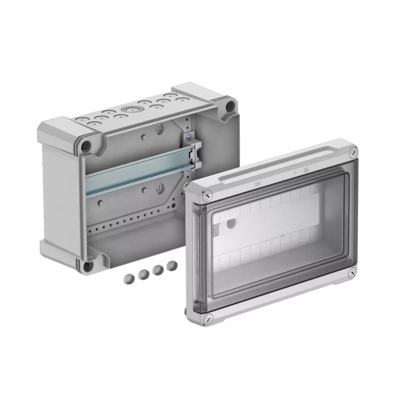 Istnieją trzy wersje wyposażenia: z zaciskami śrubowymi, z zaciskami wtykowymi i bez zacisków. Wszystkie rozmiary i wersje wyposażenia są dostępne w dwóch materiałach. Wszystkie rozdzielnice są dostarczane ze wstępnie zmontowaną szyną montażową 35 mm.