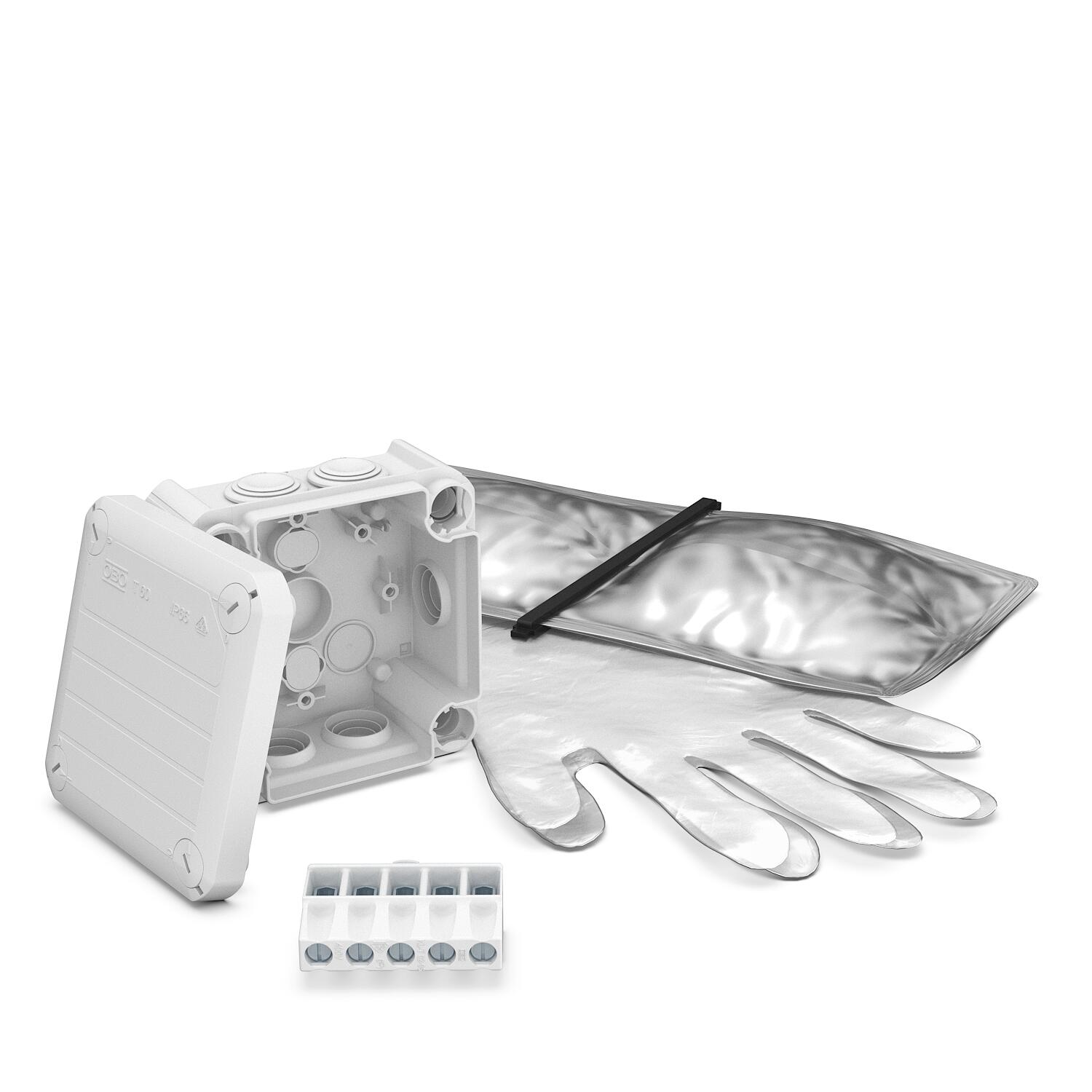 Zestaw składający się z piszki odgałęźnej z listwą zaciskową, masy uszczelniającej i pary jednorazowych rękawiczek. Puszka odgałęźna jest wykonana z tworzywa termoplastycznego - polipropylenu - z dławikami elastycznymi wykonanymi z octanu etylowinylu (EVA). Dwuskładnikowa żywica uszczelniająca w worku do ochrony instalacji elektrycznej przed wilgocią zgodnie z klasą ochrony IP 68 i obciążeniami mechanicznymi. Tworzywo to jest miękkie, co oznacza, że można je łatwo kształtować.