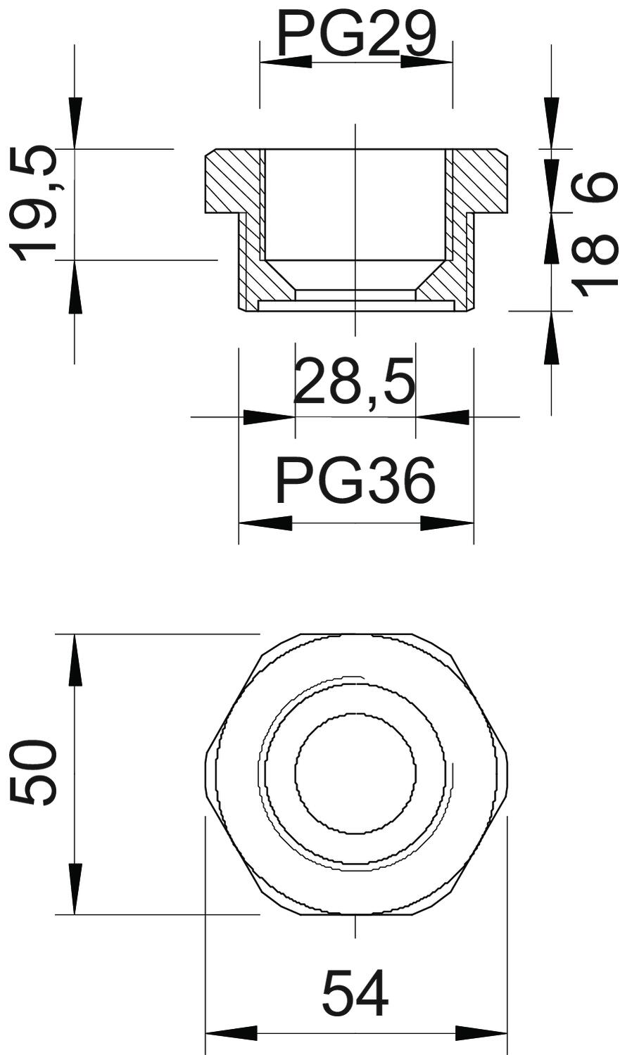 Redukcja, gwint wewnętrzny i zewnętrzny PG według DIN 40430.