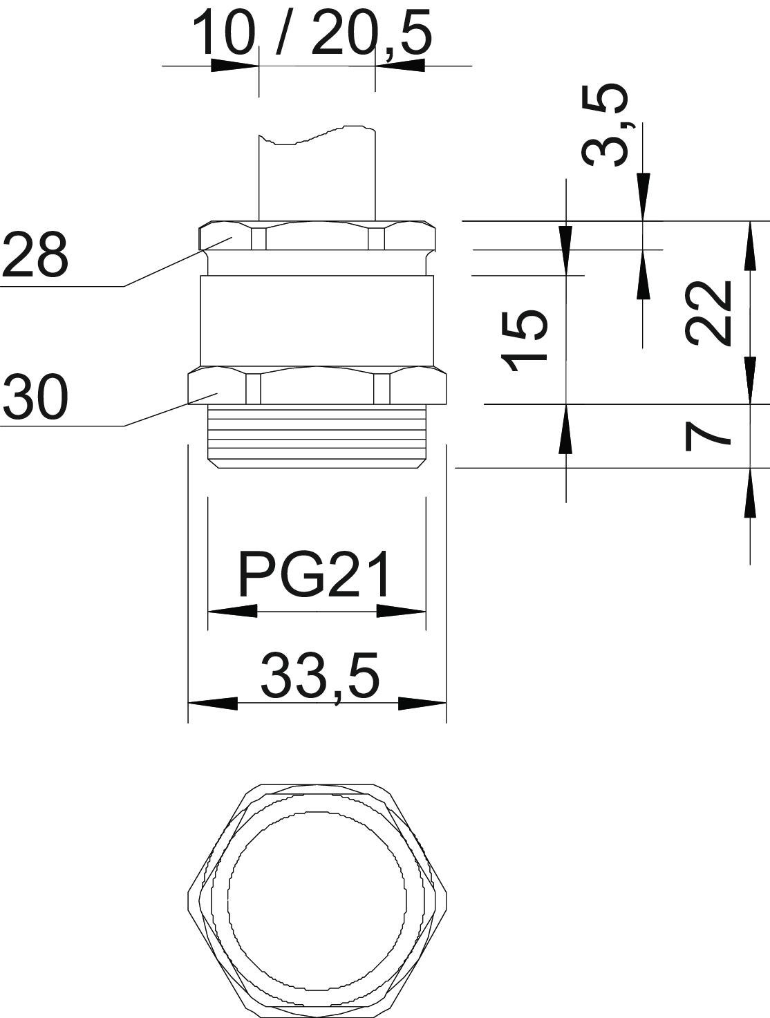 Dławik kablowy z sześciokątnym króćcem pośrednim, kształt C4 według DIN 46320, z gwintem PG według DIN 40430.