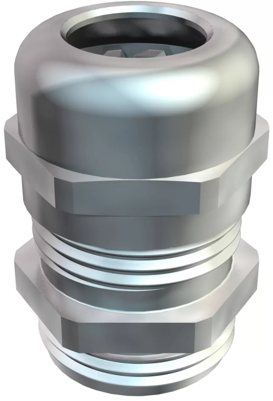 Wytrzymały dławik kablowy z gwintem PG wg DIN 40430 o konstrukcji nakrętki kołpakowej z dużym obszarem uszczelnienia, odciążenie ciągu i zabezpieczenie przed przekręceniem gwarantujące dużą szczelność. Zacisk poliamidowy, pierścień uszczelniający z chloroprenu/kauczuku nitrylowego, z zamocowanym na gwincie pierścieniem O-ring.