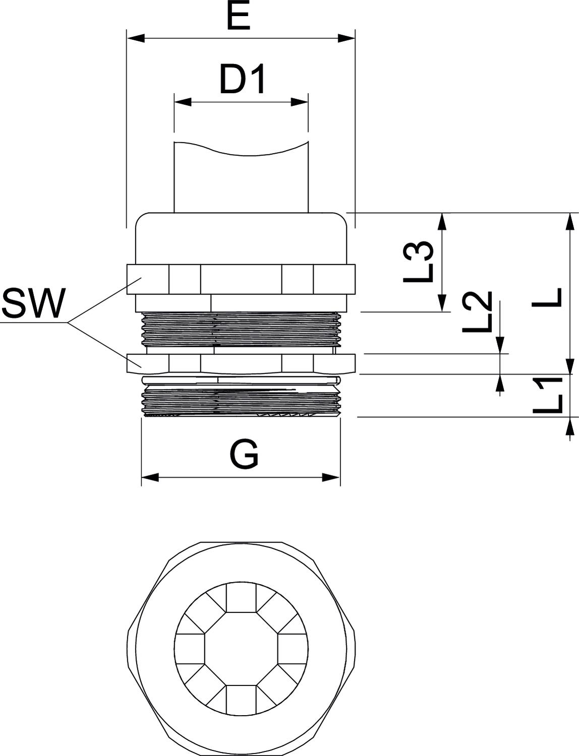 Wytrzymały dławik kablowy EMV z gwintem metrycznym wg IEC 423 o konstrukcji nakrętki kołpakowej gwarantującej dużą szczelność. Kontakt między dławikiem a ekranem kabla wytwarzany za pomocą sprężyny kontaktowej. Odciążenie ciągu, zabezpieczenie przed przekręceniem oraz szczelność na całym obszarze mocowania. Pierścień uszczelniający z neoprenu. Zacisk poliamidowy. Z zamontowanym wstępnie pierścieniem uszczelniającym gwint, zbadanym wg VDE zgodnie z DIN EN 50262, stopień ochrony IP68 przy 5 bar/1 h.