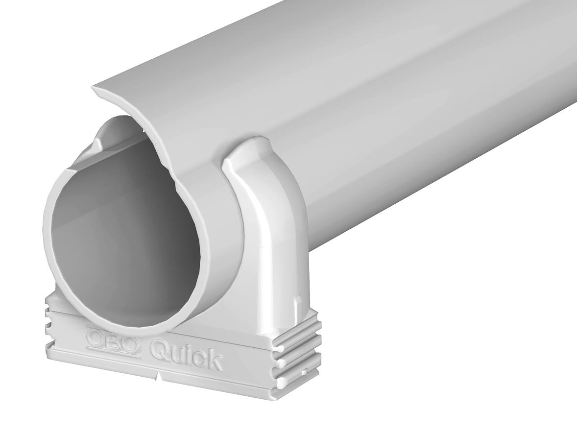 Rurka Quick-Pipe łączy zalety kanału kablowego i rurki instalacyjnej w ramach jednego inteligentnego systemu. System ten umożliwia łatwy i bezpieczny montaż powierzchniowy różnych kabli na ścianie i suficie. Quick-Pipe jest dostępny w czterech rozmiarach metrycznych: M16, M20, M25 i M32, a długość dostawy wynosi 2 m.