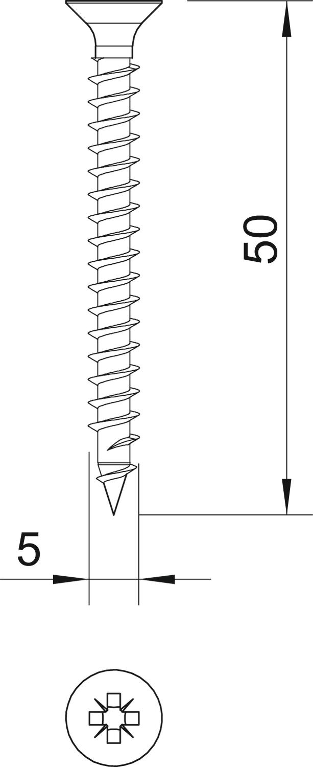 Stal hartowana, cynkowana galwanicznie i pasywowana na żółto, powłoka z hostaflonu, łeb stożkowy z rowkiem krzyżowym i do wkrętaka (Pozidrive rozm. 2 oprócz śr. 6 mm Pozidrive rozm. 3).
