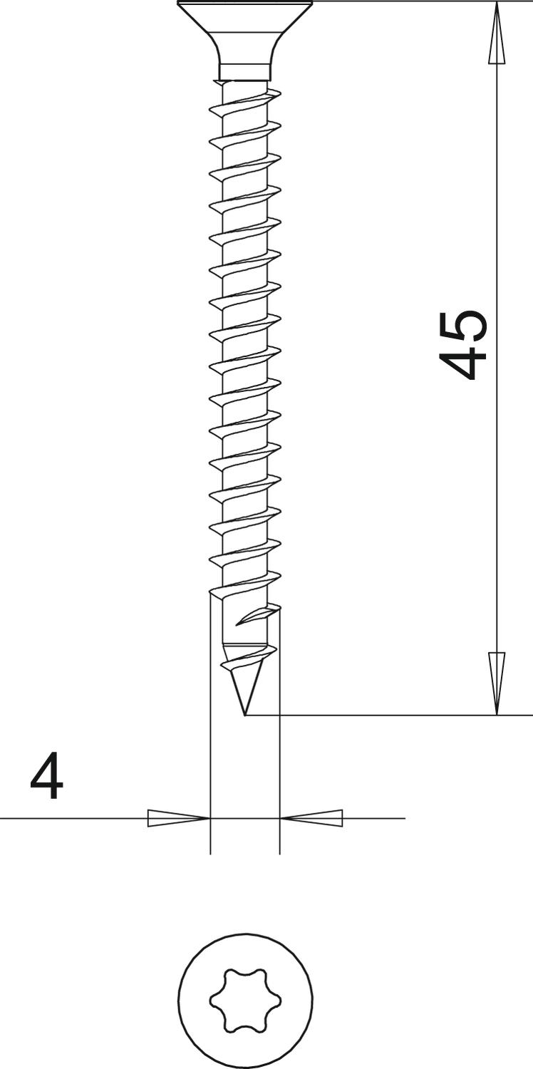 Stal hartowana, cynkowana galwanicznie i pasywowana na żółto, powłoka z hostaflonu, łeb wpuszczany z T-Bit (sześciokąt wewnętrzny), rozm. Ø 3 mm T10, Ø 3,5 mm T15, Ø 4 i 4,5 mm T20, Ø 5 mm T25.