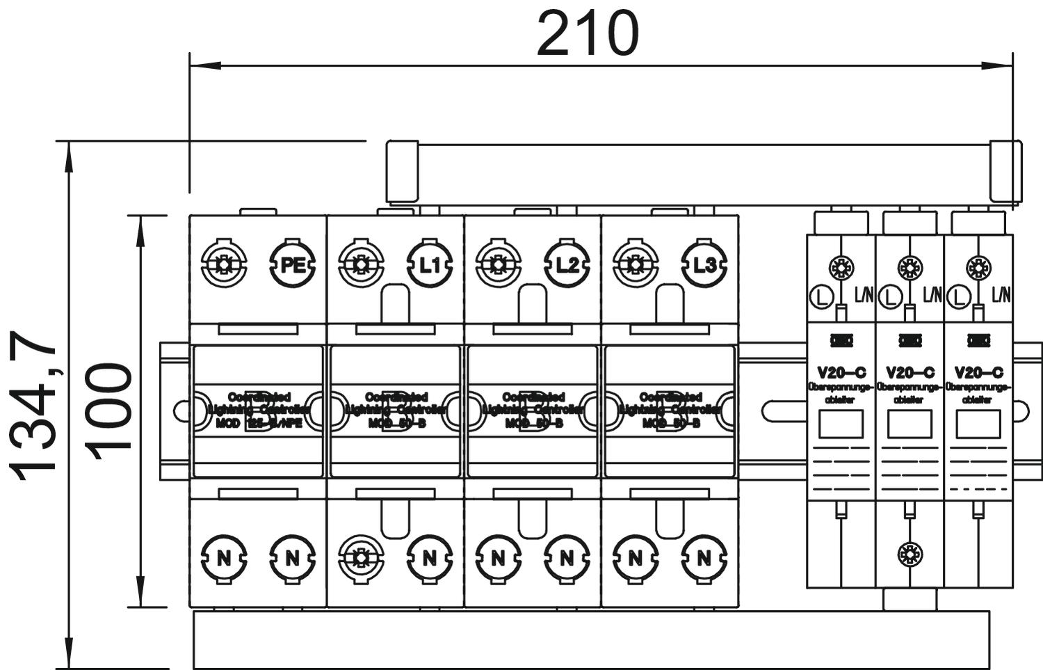 • Ogranicznik z wymiennymi wkładkami, gotowy do podłączenia, z szynami grzebieniowymi, zaciski przyłączeniowe oznaczone