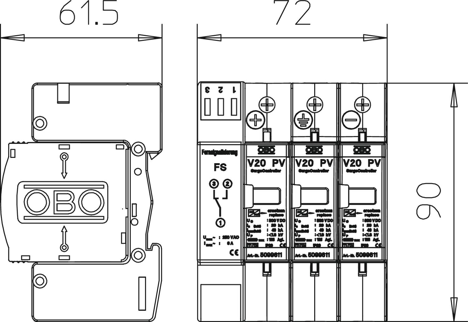 V20-C 3PHFS-600 Ogranicznik przepięć V20 3-polowy do PV ze styk. pom.