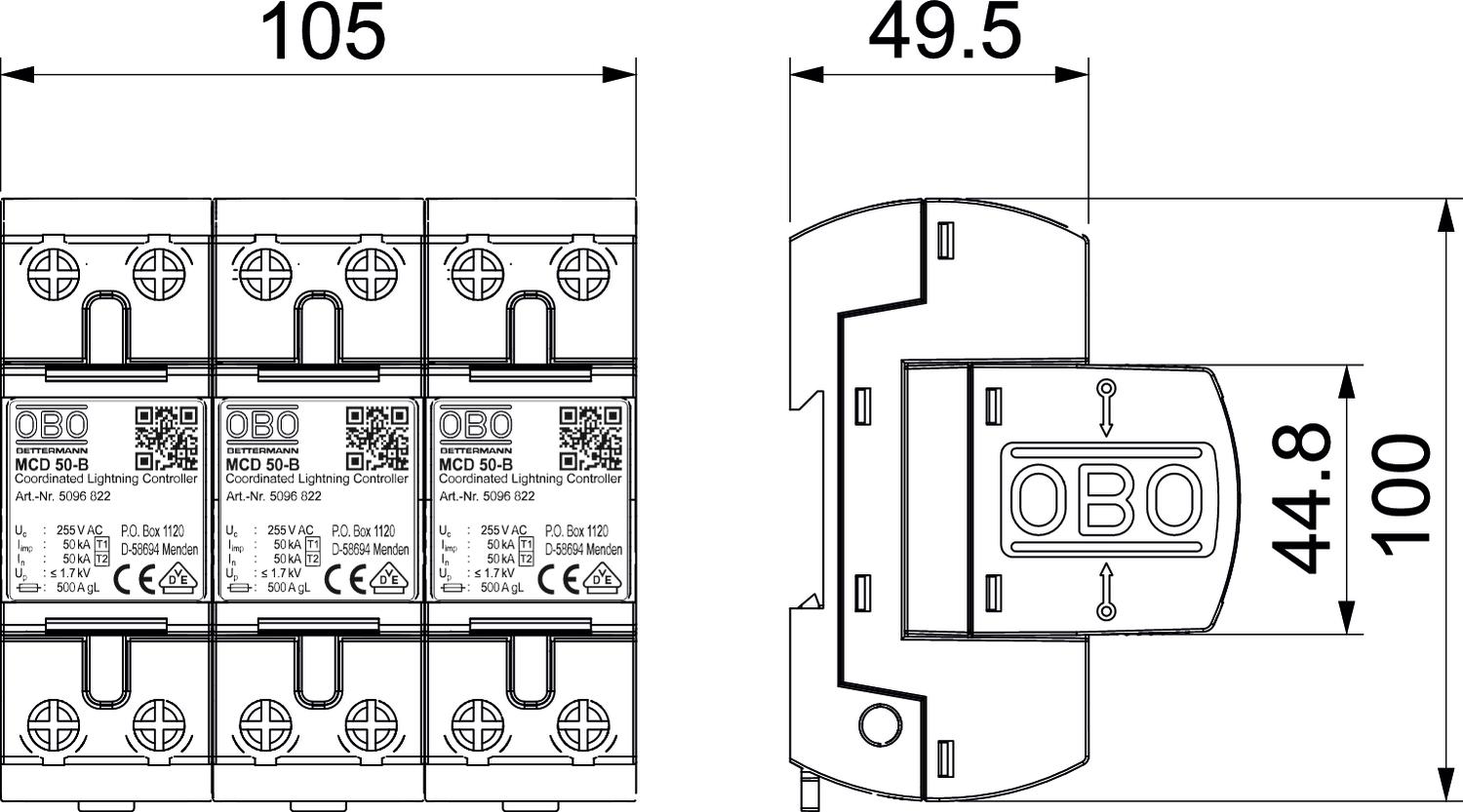 Całkowicie zmontowany i gotowy do podłączenia, składający się z: 3 x MCD 50-B: Skoordynowany ogranicznik ypu 1+2 EN 61643-11. Dla strefy 0 do 2 (LPZ) zgodnie ze strefowa koncepcją ochrony odgromowej zgodnie z IEC 61312-1 lub VDE 0185-305.