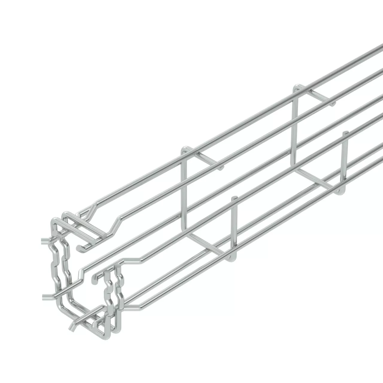 Korytko siatkowe w kształcie G ze spawanymi punktowo drutami stalowymi, o różnych wysokościach i szerokościach boków.