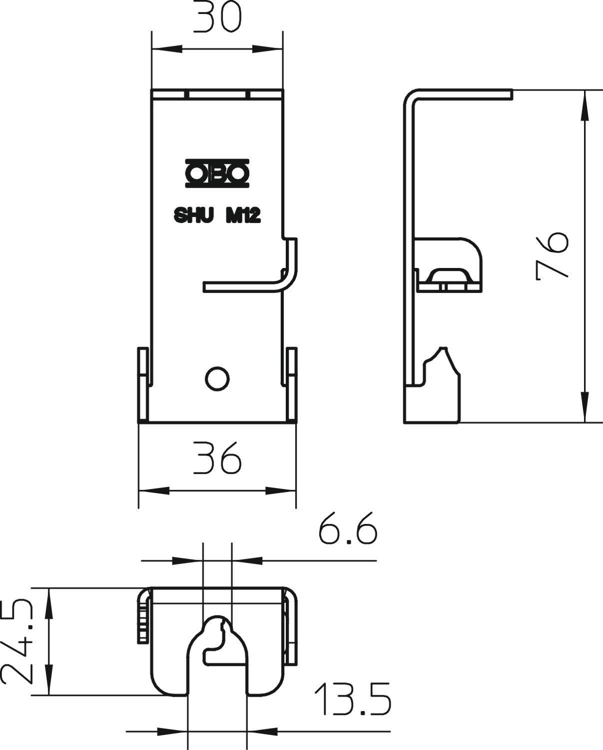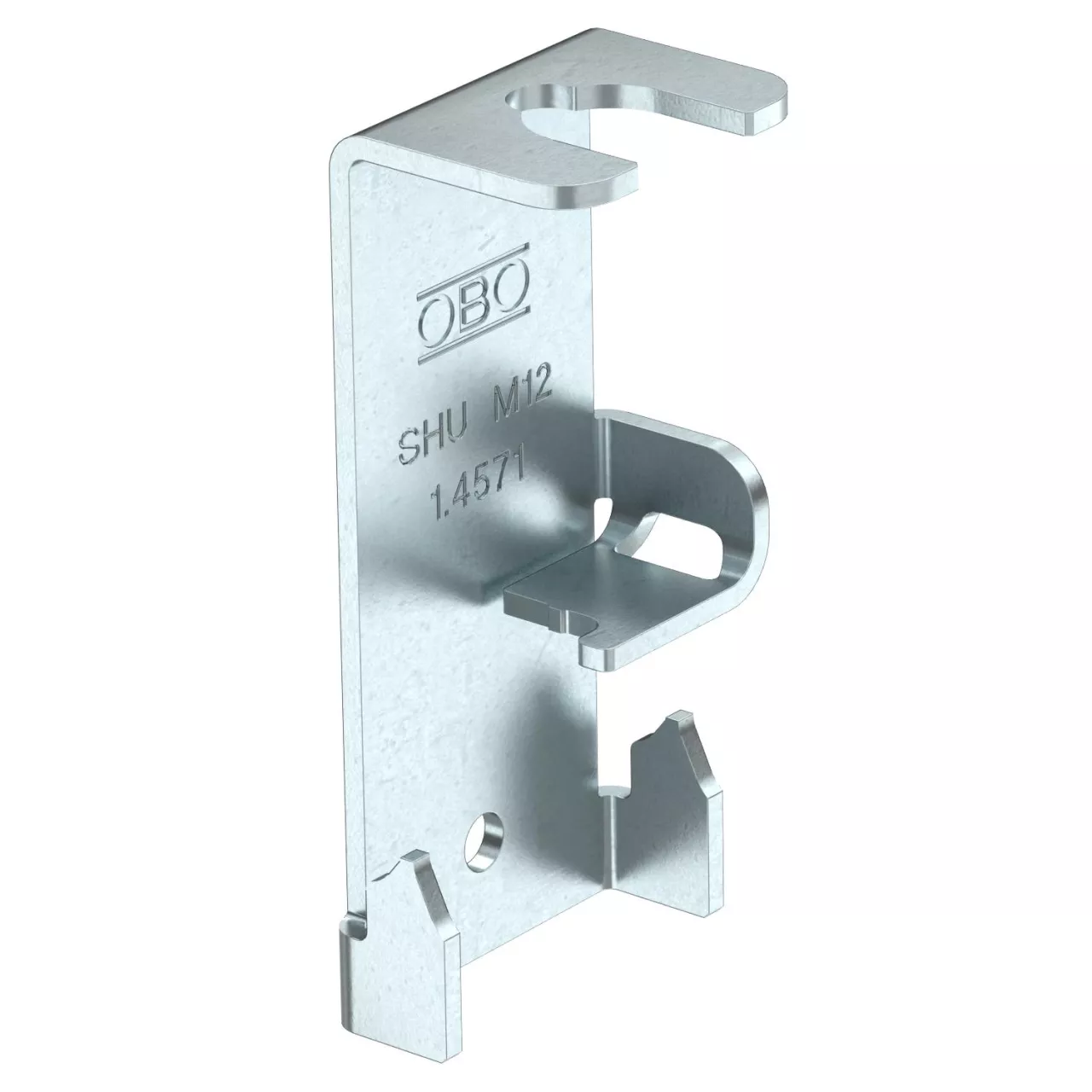 Uchwyt boczny do mocowania koryt kablowych, korytek siatkowych i drabin kablowych do ścian lub stropów za pomocą pręta gwintowanego.