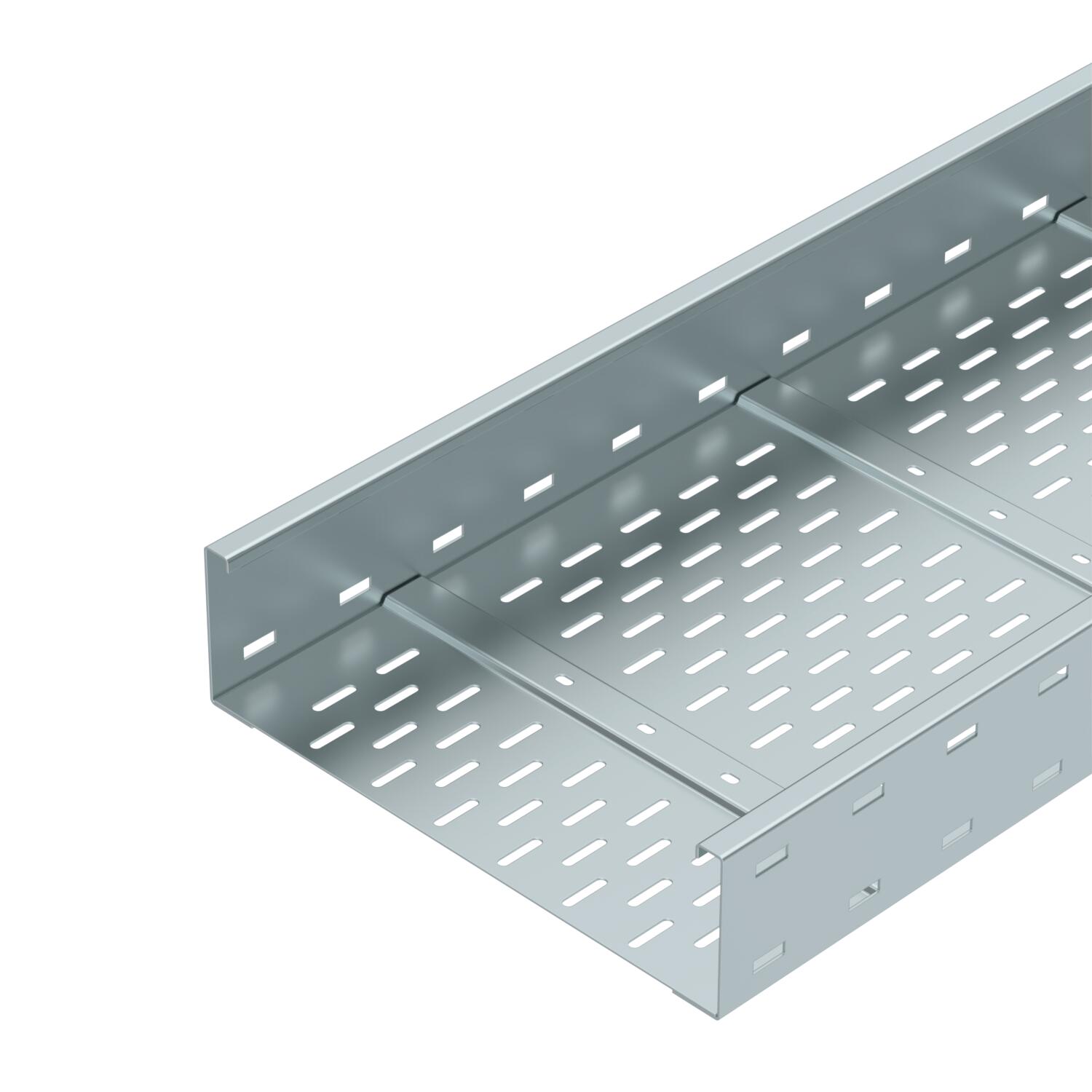 Szerokorozpiętościowe koryto kablowe, z perforacją boczną, o wysokości boku 110 mm.