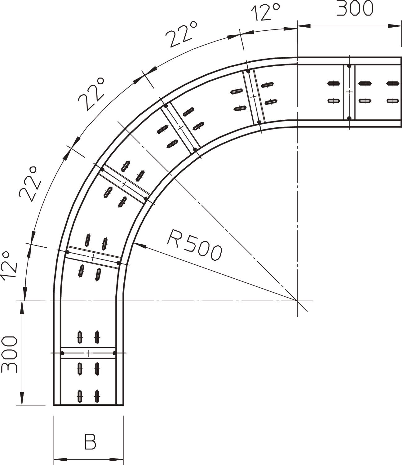 Łuk 90°, poziomy, do wszystkich korytek kablowych szerokorozpiętościowych o wys. boku 160 mm.