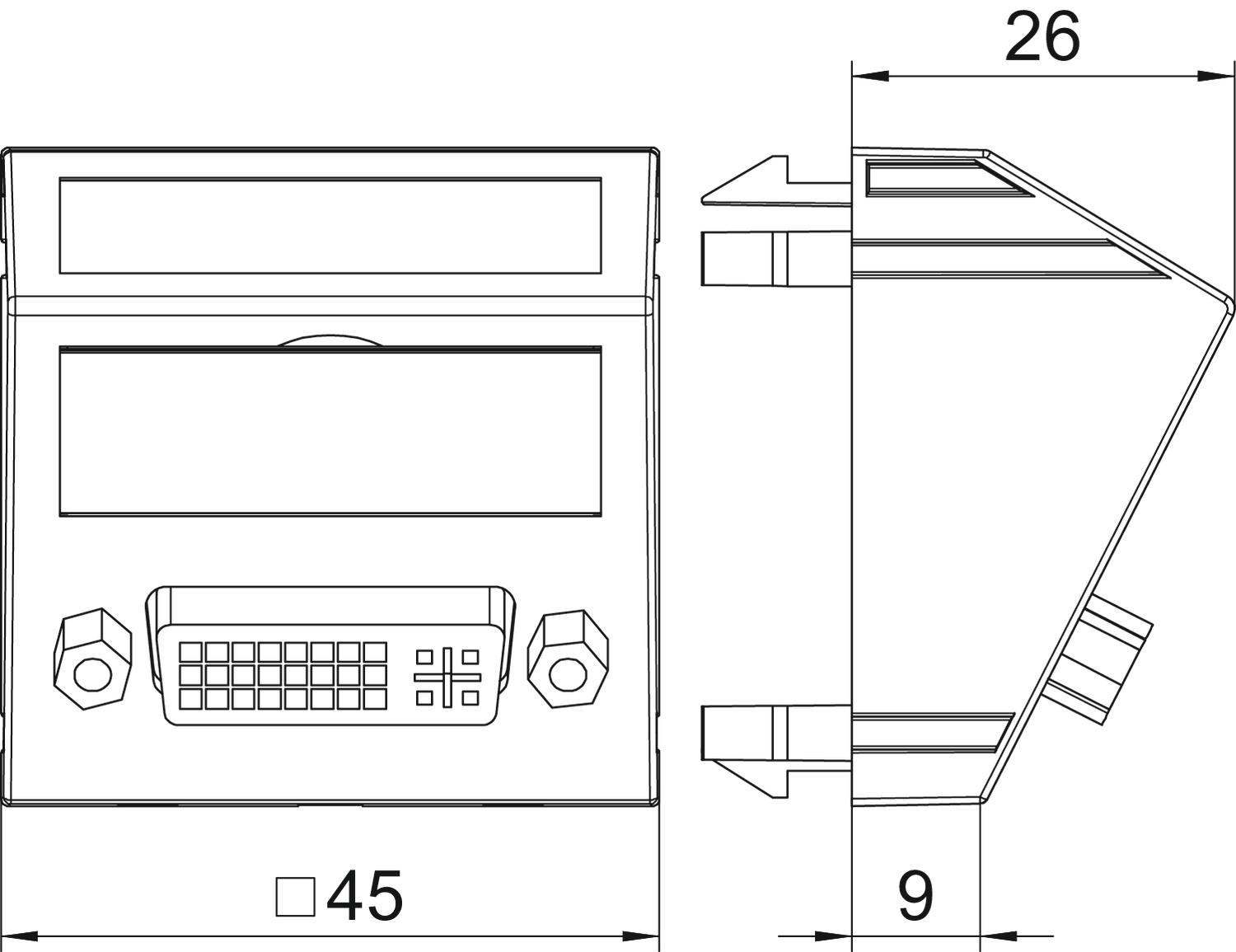 Wspornik montażowy z gniazdem DVI-D, wyjście ukośne, z polem opisowym, krótki przewód przyłączeniowy DVI-D, wersja gniazdo-gniazdo. Mocowanie zatrzaskowe do poziomego i pionowego montażu w otoczeniu systemowym.