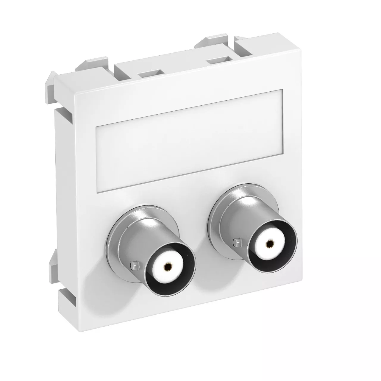 Wspornik montażowy z dwoma gniazdami BNC, wyjście proste, z polem opisowym, dwa BNC, wersja gniazdo-gniazdo. Mocowanie zatrzaskowe do poziomego i pionowego montażu w otoczeniu systemowym.