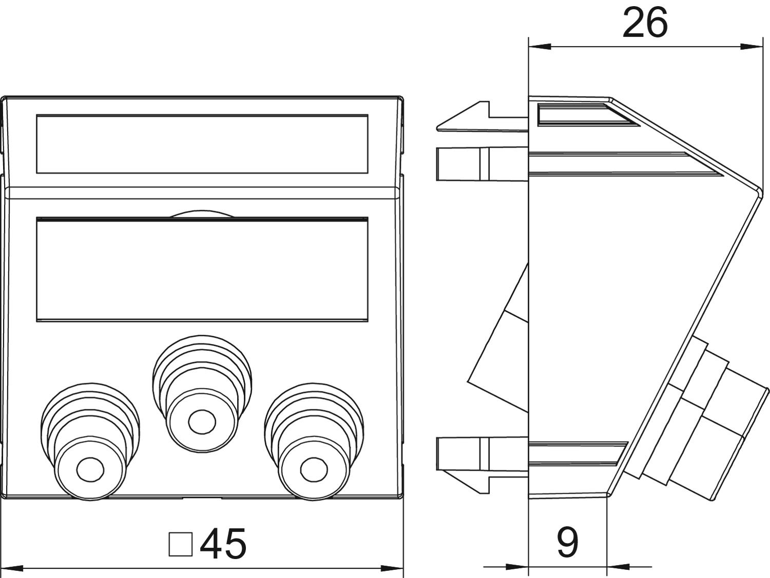 Wspornik montażowy z trzema gniazdami cinch do Video, wyjście ukośne, z polem opisowym, trzy gniazda cinch (RCA) z połączeniem lutowanym. Mocowanie zatrzaskowe do poziomego i pionowego montażu w otoczeniu systemowym.