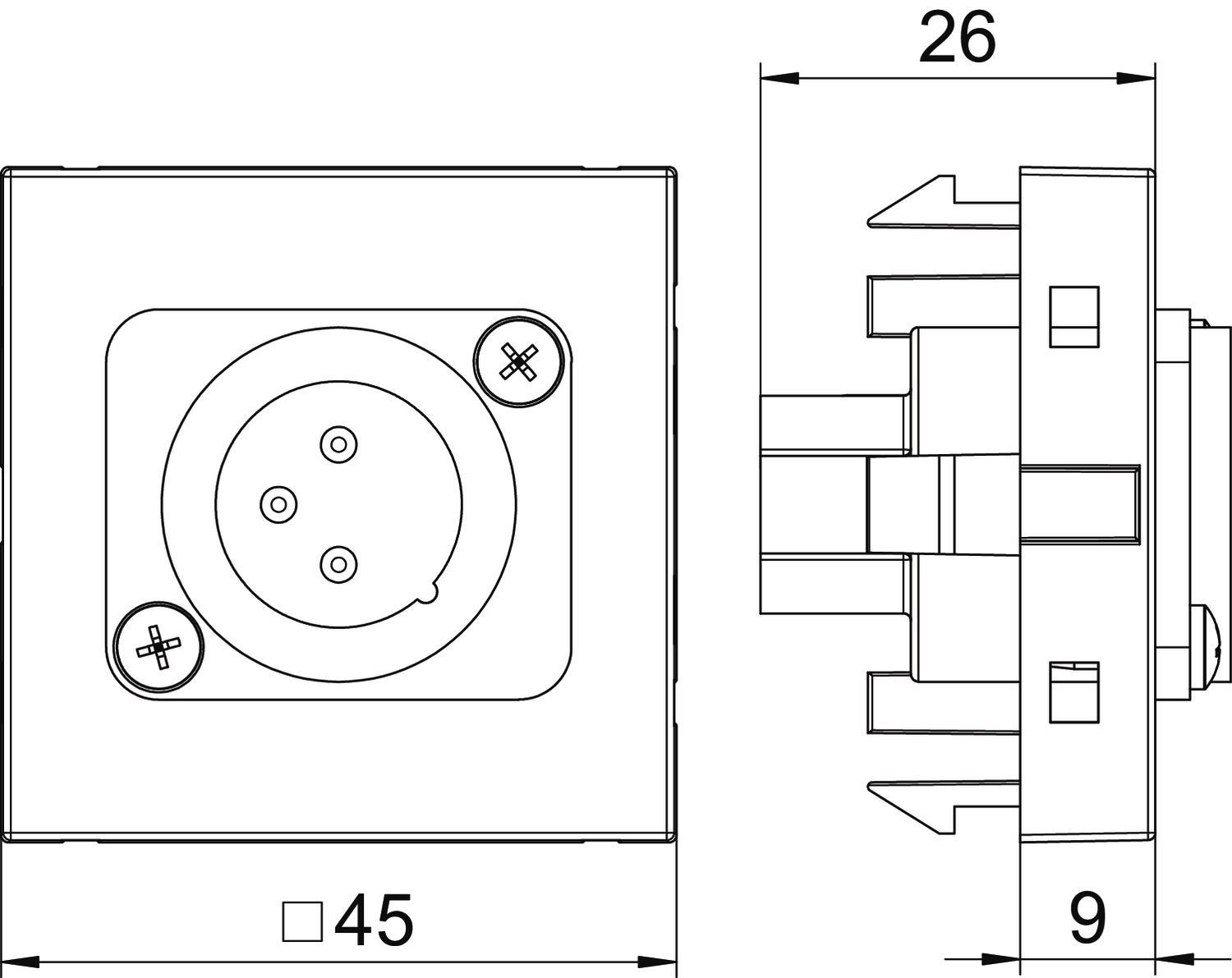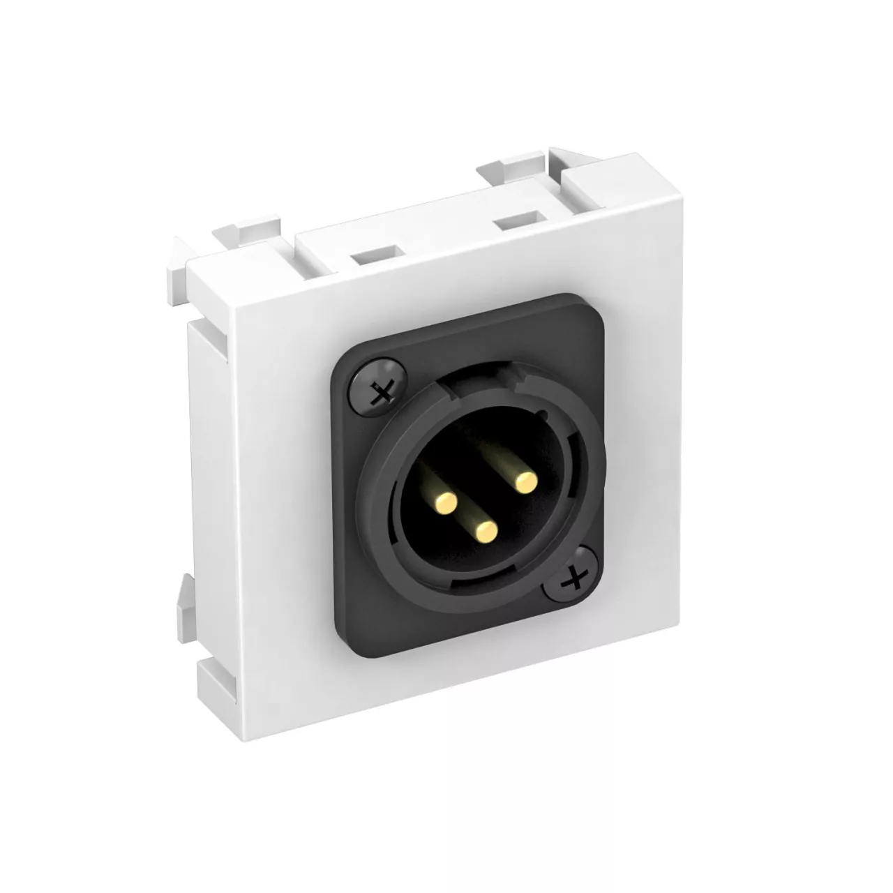 Wspornik montażowy z jednym złączem XLR, wyjście proste, bez pola opisowego, wtyczka XLR 3-pin z zaciskami śrubowymi. Mocowanie zatrzaskowe do poziomego i pionowego montażu w otoczeniu systemowym.