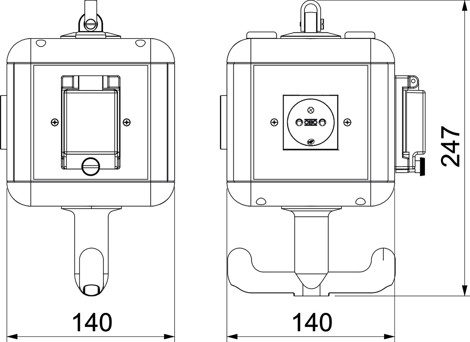 2x single sockets with earthing pin 16 A/250 V with increased touch protection, pre-wired for an AC current, connection via 1x 3-pin terminal, with partition for circuit separation and an FI/LS switch.