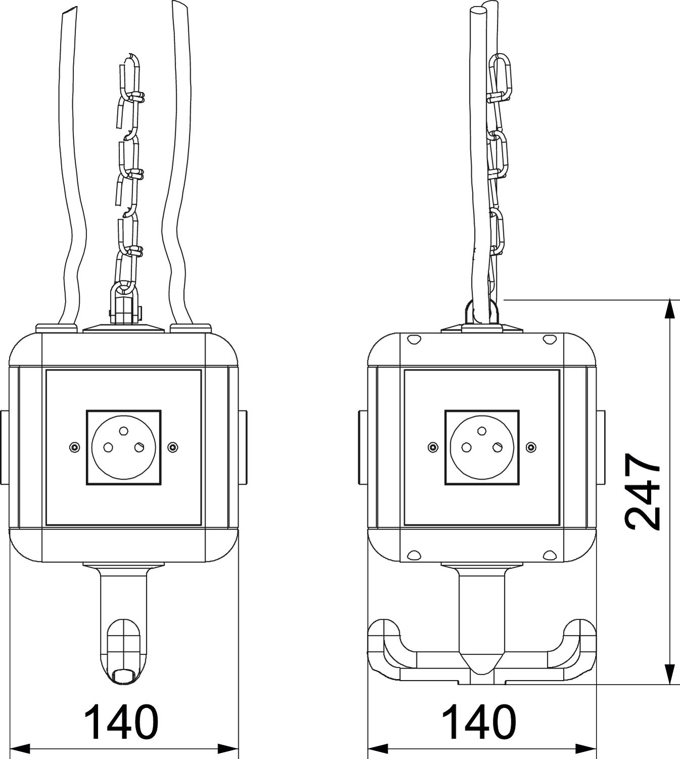 Wyposażenie: 4 x pojedyncze gniazda zasilające z bolcem uziemiającym 16 A/250 V z podwyższoną ochroną przed dotykiem, okablowanie do dwóch obwodów prądu przemiennego, podłączenie przez 2 x 3-biegunowe zaciski, z przegrodą do oddzielenia obwodów prądowych.