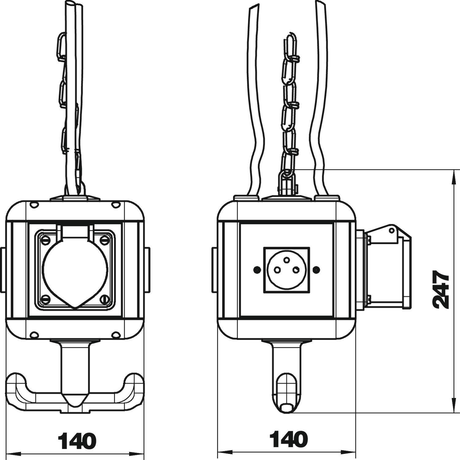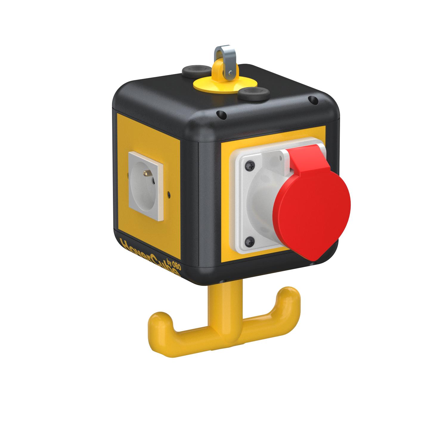 3 x pojedyncze gniazda zasilające z bolcem uziemiającym 16 A/250 V z podwyższoną ochroną przed dotykiem, okablowanie do jednego obwodu prądu przemiennego, podłączenie przez 1 x 3-biegunowy zacisk, 1 gniazdo siłowe CEE 16 A/415 V, z przegrodą do oddzielenia obwodów prądowych.