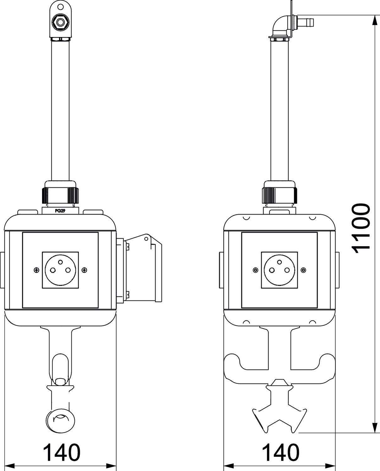 3 x pojedyncze gniazda zasilające z bolcem uziemiającym 16 A/250 V z podwyższoną ochroną przed dotykiem, okablowanie do jednego obwodu prądu przemiennego, podłączenie przez 1 x 3-biegunowy zacisk, 1 gniazdo siłowe CEE 16 A/415 V, z przegrodą do oddzielenia obwodów prądowych.