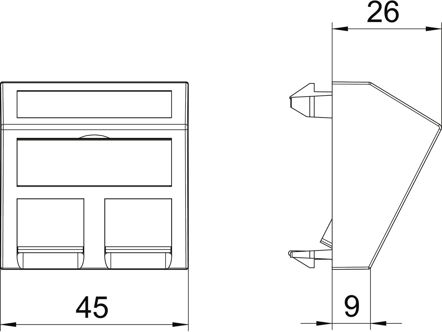 Ramka teleinformatyczna z wyjściem ukośnym na dwa moduły przyłączeniowe teleinformatyczne RJ45. Mocowanie zatrzaskowe do poziomego i pionowego montażu w otoczeniu systemowym. Typ EP ma specjalne gniazdo modułu i jest przeznaczone do mocowania pośredniego modułów transmisji danych w otworze montażowym.