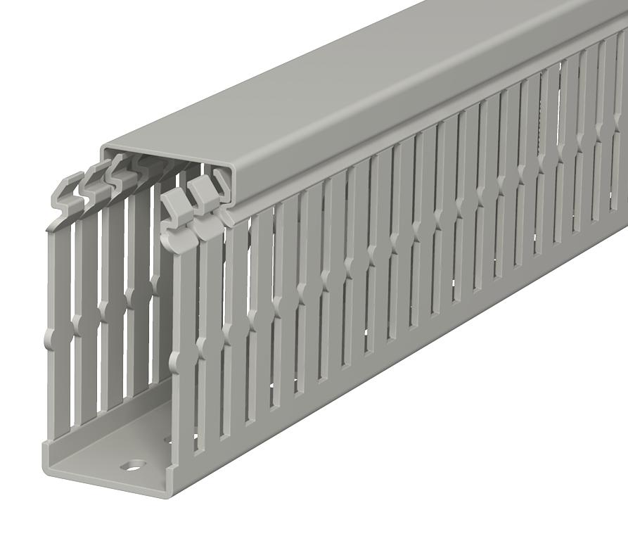 Kanał grzebieniowy wg DIN EN 50085-2-3, z pokrywą i perforacją dna, przetłoczenia grzebieni zapobiegają wypadnięciu przewodów.