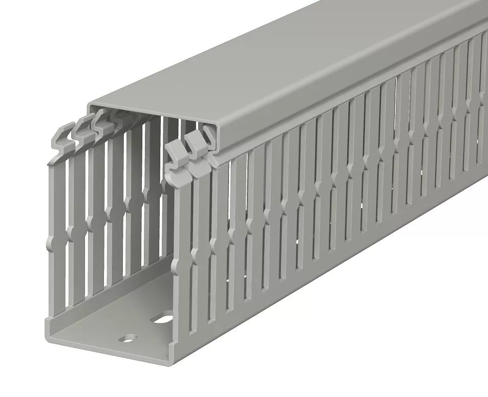 Kanał grzebieniowy wg DIN EN 50085-2-3, z pokrywą i perforacją dna, przetłoczenia grzebieni zapobiegają wypadnięciu przewodów.