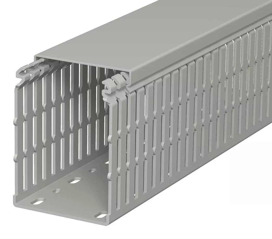 Kanał grzebieniowy wg DIN EN 50085-2-3, z pokrywą i perforacją dna, przetłoczenia grzebieni zapobiegają wypadnięciu przewodów.