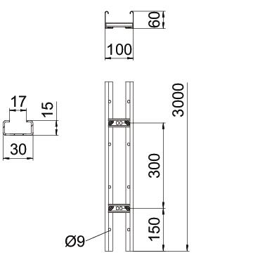 Drabina kablowa o wysokości boku 60 mm z przyspawanymi szczeblami C30 otwartymi do góry. Zagięta krawędź boczna dla wzmocnienia oraz ochrony. Mocowanie na wsporniku za pomocą zacisków typu LKS 40. Szerokość szczeliny wynosi 16,5 mm, dedykowana obejma kabłąkowa typu 2056.